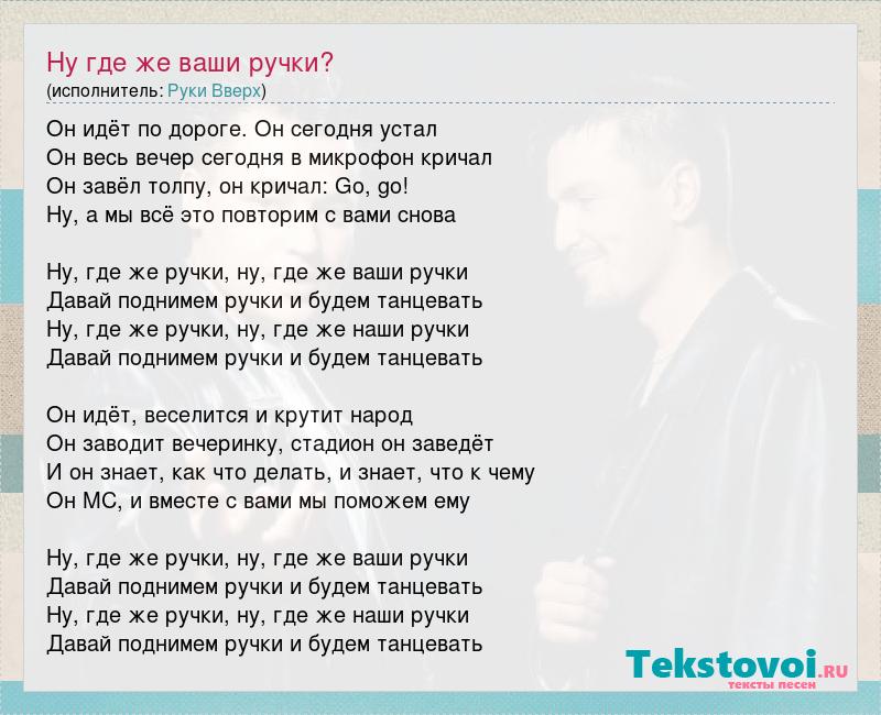 Он идёт по дороге. Он сегодня устал Он весь вечер сегодня в микрофон кричал Он завёл толпу, он кричал: Go, go! Ну, а мы всё это повторим с вами снова Ну, где же ручки, ну, где же ваши ручки Давай поднимем ручки и будем танцевать Ну, где же ручки, ну, где же наши ручки Давай поднимем ручки и будем танцевать Он идёт, веселится и крутит народ Он заводит вечеринку, стадион он заведёт И он знает, как что делать, и знает, что к чему Он MC, и вместе с вами мы поможем ему Ну, где же ручки, ну, где же ваши ручки Давай поднимем ручки и будем танцевать Ну, где же ручки, ну, где же наши ручки Давай поднимем ручки и будем танцевать