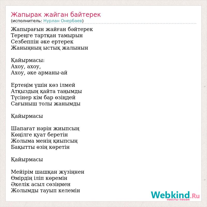 Жапырағын жайған бәйтерек Тереңге тартқан тамырын Сезбеппін әке ертерек Жаныңның ыстық жалынын Қайырмасы: Ахоу, ахоу, Ахоу, әке арманы-ай Ертеңім үшін көз ілмей Атқыздың қайта таңымды Түсінер кім бар өзіңдей Сағыныш толы жанымды Қайырмасы Шапағат нәрін жиыпсың Көңілге қуат беретін Жолыма менің қиыпсың Бақытты өзің көретін Қайырмасы Мейірім шашқан жүзіңнен Өмірдің іліп көремін Әкелік асыл сөзіңмен Жолымды тауып келемін