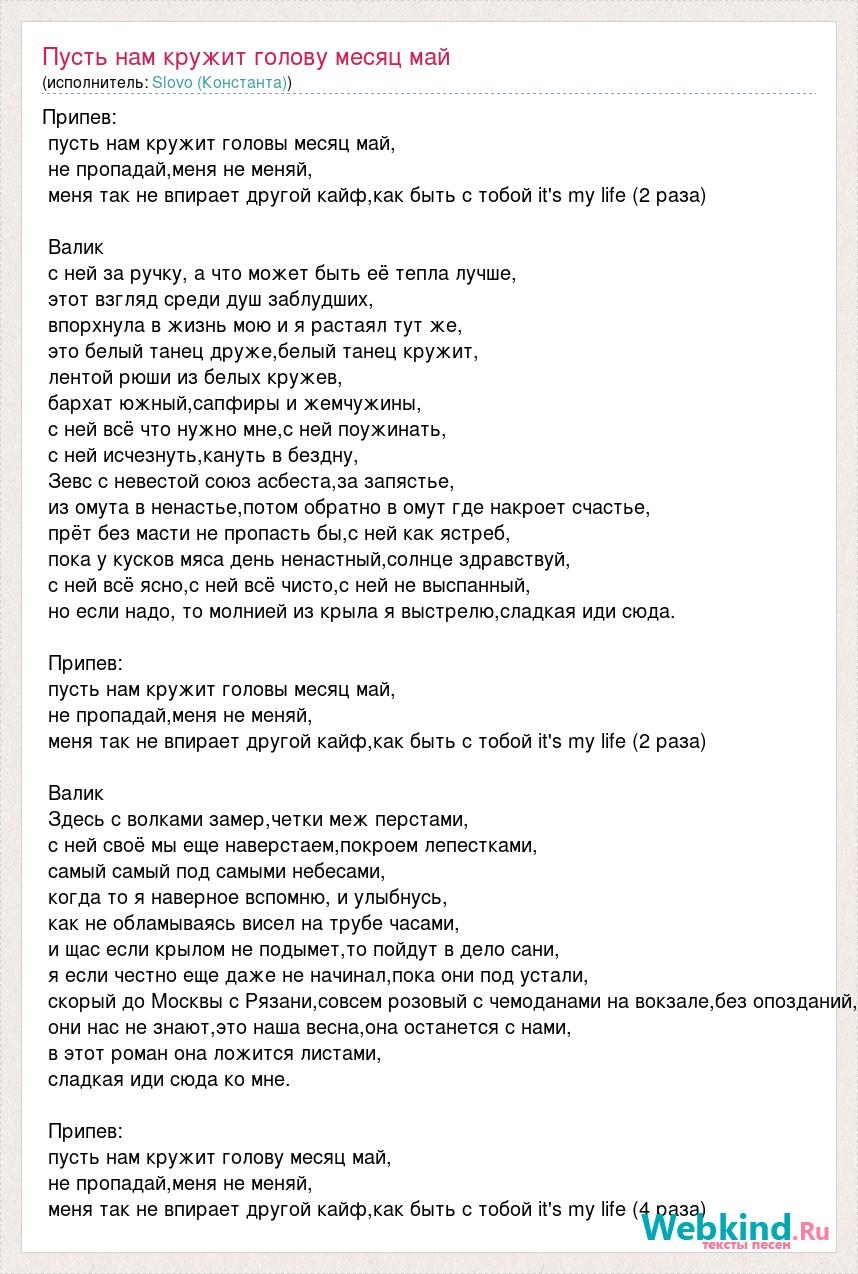Припев: пусть нам кружит головы месяц май, не пропадай,меня не меняй, меня так не впирает другой кайф,как быть с тобой it's my life (2 раза) Валик с ней за ручку, а что может быть её тепла лучше, этот взгляд среди душ заблудших, впорхнула в жизнь мою и я растаял тут же, это белый танец друже,белый танец кружит, лентой рюши из белых кружев, бархат южный,сапфиры и жемчужины, с ней всё что нужно мне,с ней поужинать, с ней исчезнуть,кануть в бездну, Зевс с невестой союз асбеста,за запястье, из омута в ненастье,потом обратно в омут где накроет счастье, прёт без масти не пропасть бы,с ней как ястреб, пока у кусков мяса день ненастный,солнце здравствуй, с ней всё ясно,с ней всё чисто,с ней не выспанный, но если надо, то молнией из крыла я выстрелю,сладкая иди сюда. Припев: пусть нам кружит головы месяц май, не пропадай,меня не меняй, меня так не впирает другой кайф,как быть с тобой it's my life (2 раза) Валик Здесь с волками замер,четки меж перстами, с ней своё мы еще наверстаем,покроем лепестками, самый самый под самыми небесами, когда то я наверное вспомню, и улыбнусь, как не обламываясь висел на трубе часами, и щас если крылом не подымет,то пойдут в дело сани, я если честно еще даже не начинал,пока они под устали, скорый до Москвы с Рязани,совсем розовый с чемоданами на вокзале,без опозданий, они нас не знают,это наша весна,она останется с нами, в этот роман она ложится листами, сладкая иди сюда ко мне. Припев: пусть нам кружит голову месяц май, не пропадай,меня не меняй, меня так не впирает другой кайф,как быть с тобой it's my life (4 раза)