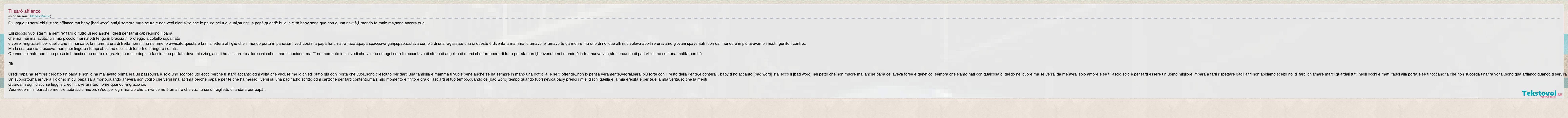 Ovunque tu sarai ehi ti starò affianco,ma baby so come stai,ti sembra tutto scuro e non vedi nientaltro che le paure nei tuoi guai,stringiti a papà,quandè buio in città,baby sono qua,non è una novità,il mondo fa male,ma,sono ancora qua. Ehi piccolo vuoi starmi a sentire?farò di tutto userò anche i gesti per farmi capire,sono il papà che non hai mai avuto,tu il mio piccolo mai nato,ti tengo in braccio ,ti proteggo a coltello sguainato e vorrei ringraziarti per quello che mi hai dato, la mamma era di fretta,non mi ha nemmeno avvisato questa è la mia lettera al figlio che il mondo porta in pancia,mi vedi così ma papà ha un'altra faccia,papà spacciava ganja,papà..stava con più di una ragazza,e una di queste è diventata mamma,io amavo lei,amavo te da morire ma uno di noi due allinizio voleva abortire eravamo,giovani spaventati fuori dal mondo e in più,avevamo i nostri genitori contro.. Ma la sua,pancia cresceva..non puoi fingere i tempi abbiamo deciso di tenerti e stringere i denti.. Quando sei nato,non ti ho preso in braccio e ho detto dio grazie,un mese dopo in fascie ti ho portato dove mio zio giace,ti ho sussurrato allorecchio che i marci muoiono, ma ** ne momento in cui vedi che volano ed ogni sera ti raccontavo di storie di angeli,e di marci che farebbero di tutto per sfamarsi,benvenuto nel mondo,è la tua nuova vita,sto cercando di parlarti di me con una matita perché.. Rit. Credi,papà,ha sempre cercato un papà e non lo ha mai avuto,prima era un pazzo,ora è solo uno sconosciuto ecco perché ti starò accanto ogni volta che vuoi,se me lo chiedi butto giù ogni porta che vuoi..sono cresciuto per darti una famiglia e mamma ti vuole bene anche se ha sempre in mano una bottiglia..e se ti offende..non lo pensa veramente,vedrai,sarai più forte con il resto della gente,e conterai.. baby ti ho accanto so come stai ecco il bruciore nel petto che non muore mai,anche papà ce laveva forse è genetico, sembra che siamo nati con qualcosa di gelido nel cuore ma se verrai da me avrai solo amore e se ti lascio solo è per farti essere un uomo migliore impara a farti rispettare dagli altri,non abbiamo scelto noi di farci chiamare marci,guardali tutti negli occhi e metti fauci alla porta,e se ti toccano fa che non succeda unaltra volta..sono qua affianco quando ti servirà Un supporto,ma arriverà il giorno in cui papà sarà morto,quando arriverà non voglio che versi una lacrima perché papà è per te che ha messo i versi su una pagina,ho scritto ogni canzone per farti contento,ma il mio momento è finito è ora di lasciarti al tuo tempo,quando cè brutto tempo,quando fuori nevica,baby prendi i miei dischi quella è la mia eredità è per tè,è la mia verità,so che la meriti Guarda in ogni disco se leggi 3 crediti troverai il tuo nome quando ringrazio dio Vuoi vedermi in paradiso mentre abbraccio mio zio?Vedi,per ogni marcio che arriva ce ne è un altro che va.. tu sei un biglietto di andata per papà..