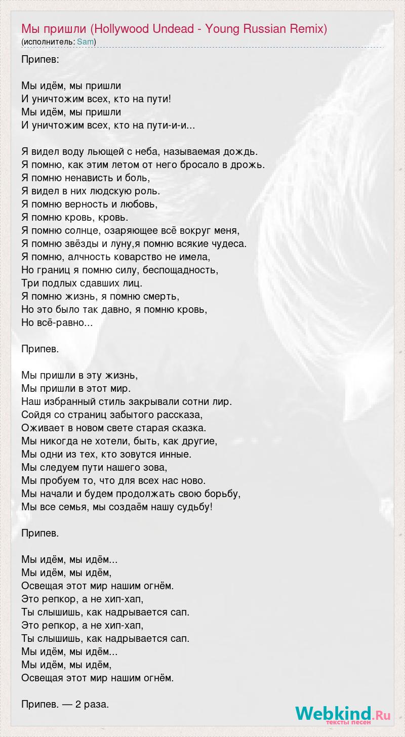 Припев: Мы идём, мы пришли И уничтожим всех, кто на пути! Мы идём, мы пришли И уничтожим всех, кто на пути-и-и... Я видел воду льющей с неба, называемая дождь. Я помню, как этим летом от него бросало в дрожь. Я помню ненависть и боль, Я видел в них людскую роль. Я помню верность и любовь, Я помню кровь, кровь. Я помню солнце, озаряющее всё вокруг меня, Я помню звёзды и луну,я помню всякие чудеса. Я помню, алчность коварство не имела, Но границ я помню силу, беспощадность, Три подлых сдавших лиц. Я помню жизнь, я помню смерть, Но это было так давно, я помню кровь, Но всё-равно... Припев. Мы пришли в эту жизнь, Мы пришли в этот мир. Наш избранный стиль закрывали сотни лир. Сойдя со страниц забытого рассказа, Оживает в новом свете старая сказка. Мы никогда не хотели, быть, как другие, Мы одни из тех, кто зовутся инные. Мы следуем пути нашего зова, Мы пробуем то, что для всех нас ново. Мы начали и будем продолжать свою борьбу, Мы все семья, мы создаём нашу судьбу! Припев. Мы идём, мы идём... Мы идём, мы идём, Освещая этот мир нашим огнём. Это репкор, а не хип-хап, Ты слышишь, как надрывается сап. Это репкор, а не хип-хап, Ты слышишь, как надрывается сап. Мы идём, мы идём... Мы идём, мы идём, Освещая этот мир нашим огнём. Припев. — 2 раза.