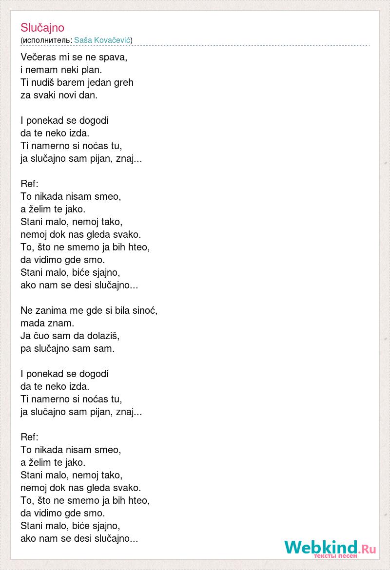 Večeras mi se ne spava, i nemam neki plan. Ti nudiš barem jedan greh za svaki novi dan. I ponekad se dogodi da te neko izda. Ti namerno si noćas tu, ja slučajno sam pijan, znaj... Ref: To nikada nisam smeo, a želim te jako. Stani malo, nemoj tako, nemoj dok nas gleda svako. To, što ne smemo ja bih hteo, da vidimo gde smo. Stani malo, biće sjajno, ako nam se desi slučajno... Ne zanima me gde si bila sinoć, mada znam. Ja čuo sam da dolaziš, pa slučajno sam sam. I ponekad se dogodi da te neko izda. Ti namerno si noćas tu, ja slučajno sam pijan, znaj... Ref: To nikada nisam smeo, a želim te jako. Stani malo, nemoj tako, nemoj dok nas gleda svako. To, što ne smemo ja bih hteo, da vidimo gde smo. Stani malo, biće sjajno, ako nam se desi slučajno...