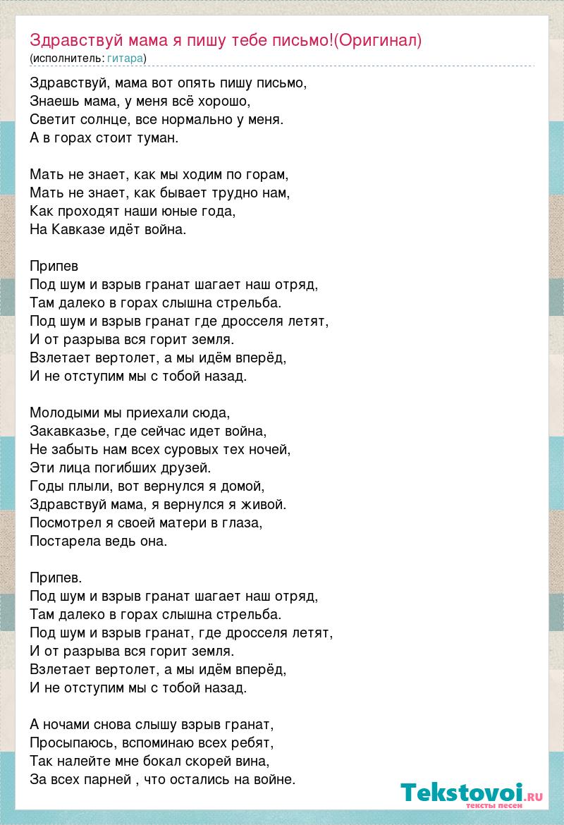 Здравствуй, мама вот опять пишу письмо, Знаешь мама, у меня всё хорошо, Светит солнце, все нормально у меня. А в горах стоит туман. Мать не знает, как мы ходим по горам, Мать не знает, как бывает трудно нам, Как проходят наши юные года, На Кавказе идёт война. Припев Под шум и взрыв гранат шагает наш отряд, Там далеко в горах слышна стрельба. Под шум и взрыв гранат где дросселя летят, И от разрыва вся горит земля. Взлетает вертолет, а мы идём вперёд, И не отступим мы с тобой назад. Молодыми мы приехали сюда, Закавказье, где сейчас идет война, Не забыть нам всех суровых тех ночей, Эти лица погибших друзей. Годы плыли, вот вернулся я домой, Здравствуй мама, я вернулся я живой. Посмотрел я своей матери в глаза, Постарела ведь она. Припев. Под шум и взрыв гранат шагает наш отряд, Там далеко в горах слышна стрельба. Под шум и взрыв гранат, где дросселя летят, И от разрыва вся горит земля. Взлетает вертолет, а мы идём вперёд, И не отступим мы с тобой назад. А ночами снова слышу взрыв гранат, Просыпаюсь, вспоминаю всех ребят, Так налейте мне бокал скорей вина, За всех парней , что остались на войне.