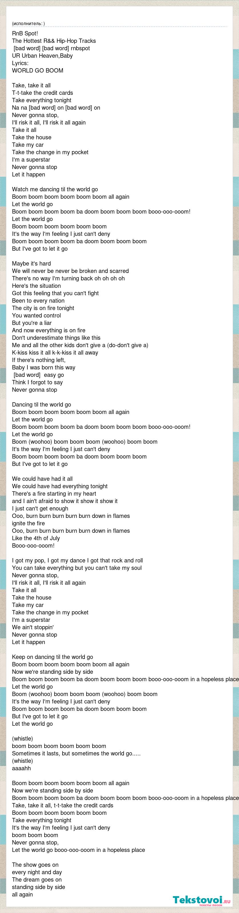 RnB Spot! The Hottest R&& Hip-Hop Tracks [bad word] [bad word] rnbspot UR Urban Heaven,Baby Lyrics: WORLD GO BOOM Take, take it all T-t-take the credit cards Take everything tonight Na na [bad word] on [bad word] on Never gonna stop, I'll risk it all, I'll risk it all again Take it all Take the house Take my car Take the change in my pocket I'm a superstar Never gonna stop Let it happen Watch me dancing til the world go Boom boom boom boom boom boom all again Let the world go Boom boom boom boom ba doom boom boom boom booo-ooo-ooom! Let the world go Boom boom boom boom boom boom It's the way I'm feeling I just can't deny Boom boom boom boom ba doom boom boom boom But I've got to let it go Maybe it's hard We will never be never be broken and scarred There's no way I'm turning back oh oh oh oh Here's the situation Got this feeling that you can't fight Been to every nation The city is on fire tonight You wanted control But you're a liar And now everything is on fire Don't underestimate things like this Me and all the other kids don't give a (do-don't give a) K-kiss kiss it all k-k-kiss it all away If there's nothing left, Baby I was born this way [bad word] easy go Think I forgot to say Never gonna stop Dancing til the world go Boom boom boom boom boom boom all again Let the world go Boom boom boom boom ba doom boom boom boom booo-ooo-ooom! Let the world go Boom (woohoo) boom boom boom (woohoo) boom boom It's the way I'm feeling I just can't deny Boom boom boom boom ba doom boom boom boom But I've got to let it go We could have had it all We could have had everything tonight There's a fire starting in my heart and I ain't afraid to show it show it show it I just can't get enough Ooo, burn burn burn burn burn down in flames ignite the fire Ooo, burn burn burn burn burn down in flames Like the 4th of July Booo-ooo-ooom! I got my pop, I got my dance I got that rock and roll You can take everything but you can't take my soul Never gonna stop, I'll risk it all, I'll risk it all again Take it all Take the house Take my car Take the change in my pocket I'm a superstar We ain't stoppin' Never gonna stop Let it happen Keep on dancing til the world go Boom boom boom boom boom boom all again Now we're standing side by side Boom boom boom boom ba doom boom boom boom booo-ooo-ooom in a hopeless place Let the world go Boom (woohoo) boom boom boom (woohoo) boom boom It's the way I'm feeling I just can't deny Boom boom boom boom ba doom boom boom boom But I've got to let it go Let the world go (whistle) boom boom boom boom boom boom Sometimes it lasts, but sometimes the world go..... (whistle) aaaahh Boom boom boom boom boom boom all again Now we're standing side by side Boom boom boom boom ba doom boom boom boom booo-ooo-ooom in a hopeless place Take, take it all, t-t-take the credit cards Boom boom boom boom boom boom Take everything tonight It's the way I'm feeling I just can't deny boom boom boom Never gonna stop, Let the world go booo-ooo-ooom in a hopeless place The show goes on every night and day The dream goes on standing side by side all again