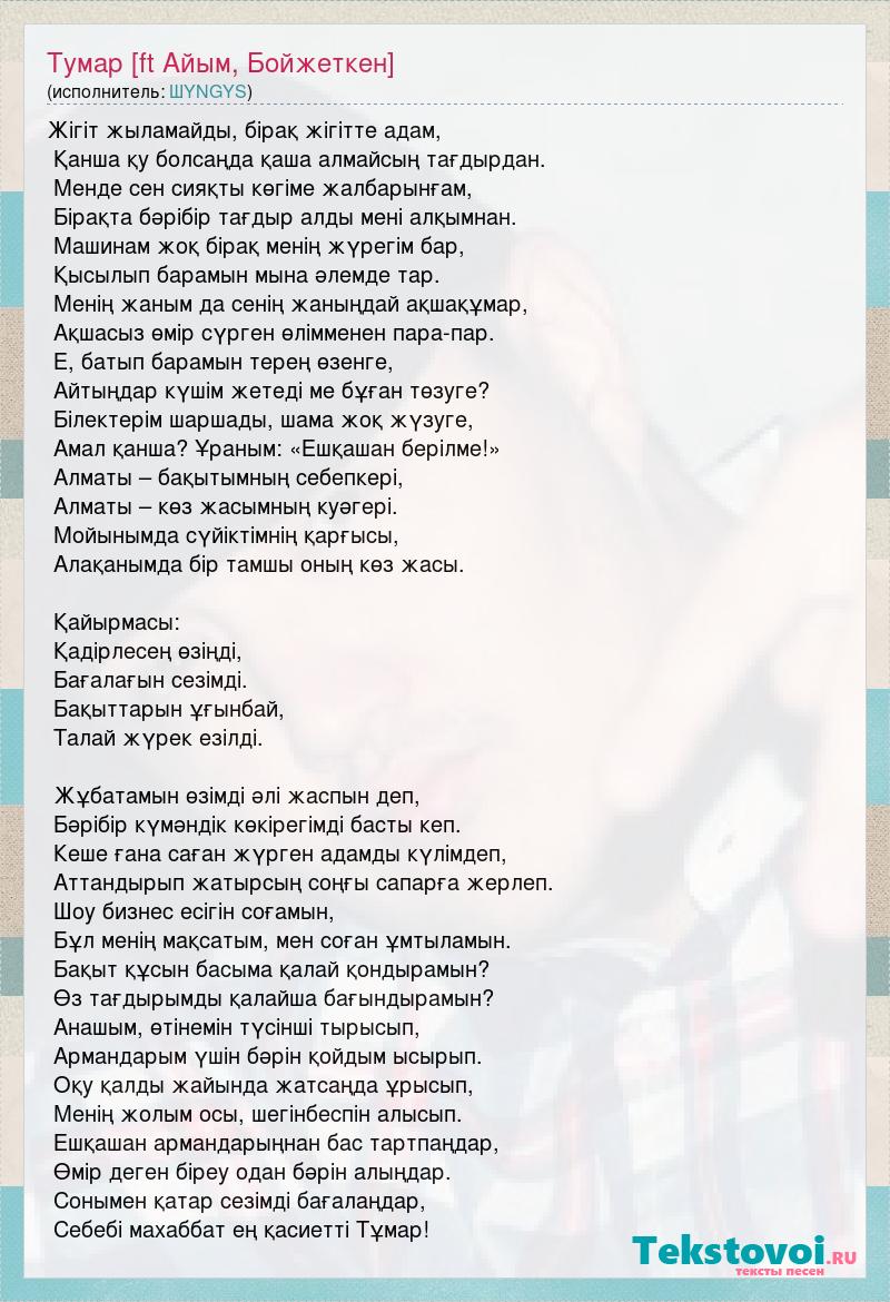 Жігіт жыламайды, бірақ жігітте адам, Қанша қу болсаңда қаша алмайсың тағдырдан. Менде сен сияқты көгіме жалбарынғам, Бірақта бәрібір тағдыр алды мені алқымнан. Машинам жоқ бірақ менің жүрегім бар, Қысылып барамын мына әлемде тар. Менің жаным да сенің жаныңдай ақшақұмар, Ақшасыз өмір сүрген өлімменен пара-пар. Е, батып барамын терең өзенге, Айтыңдар күшім жетеді ме бұған төзуге? Білектерім шаршады, шама жоқ жүзуге, Амал қанша? Ұраным: «Ешқашан берілме!» Алматы – бақытымның себепкері, Алматы – көз жасымның куәгері. Мойынымда сүйіктімнің қарғысы, Алақанымда бір тамшы оның көз жасы. Қайырмасы: Қадірлесең өзіңді, Бағалағын сезімді. Бақыттарын ұғынбай, Талай жүрек езілді. Жұбатамын өзімді әлі жаспын деп, Бәрібір күмәндік көкірегімді басты кеп. Кеше ғана саған жүрген адамды күлімдеп, Аттандырып жатырсың соңғы сапарға жерлеп. Шоу бизнес есігін соғамын, Бұл менің мақсатым, мен соған ұмтыламын. Бақыт құсын басыма қалай қондырамын? Өз тағдырымды қалайша бағындырамын? Анашым, өтінемін түсінші тырысып, Армандарым үшін бәрін қойдым ысырып. Оқу қалды жайында жатсаңда ұрысып, Менің жолым осы, шегінбеспін алысып. Ешқашан армандарыңнан бас тартпаңдар, Өмір деген біреу одан бәрін алыңдар. Сонымен қатар сезімді бағалаңдар, Себебі махаббат ең қасиетті Тұмар!