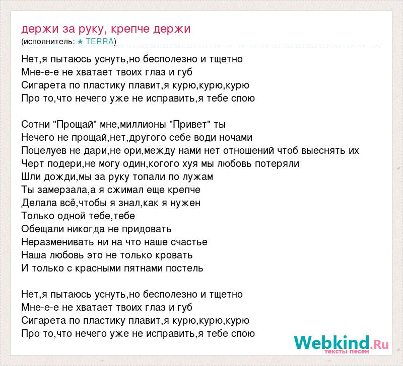Нет,я пытаюсь уснуть,но бесполезно и тщетно Мне-е-е не хватает твоих глаз и губ Сигарета по пластику плавит,я курю,курю,курю Про то,что нечего уже не исправить,я тебе спою Сотни "Прощай" мне,миллионы "Привет" ты Нечего не прощай,нет,другого себе води ночами Поцелуев не дари,не ори,между нами нет отношений чтоб выеснять их Черт подери,не могу один,когого хуя мы любовь потеряли Шли дожди,мы за руку топали по лужам Ты замерзала,а я сжимал еще крепче Делала всё,чтобы я знал,как я нужен Только одной тебе,тебе Обещали никогда не придовать Неразменивать ни на что наше счастье Наша любовь это не только кровать И только с красными пятнами постель Нет,я пытаюсь уснуть,но бесполезно и тщетно Мне-е-е не хватает твоих глаз и губ Сигарета по пластику плавит,я курю,курю,курю Про то,что нечего уже не исправить,я тебе спою