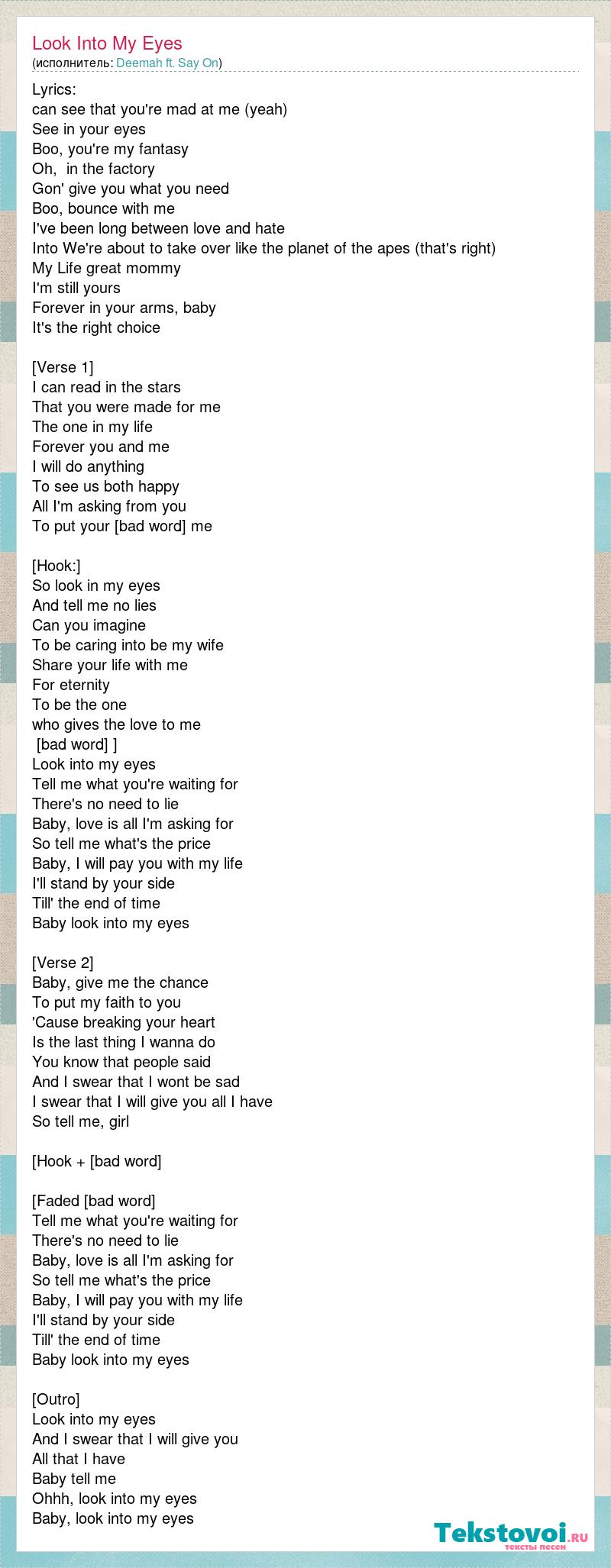 Lyrics: can see that you're mad at me (yeah) See in your eyes Boo, you're my fantasy Oh, in the factory Gon' give you what you need Boo, bounce with me I've been long between love and hate Into We're about to take over like the planet of the apes (that's right) My Life great mommy I'm still yours Forever in your arms, baby It's the right choice [Verse 1] I can read in the stars That you were made for me The one in my life Forever you and me I will do anything To see us both happy All I'm asking from you To put your trust me [Hook:] So look in my eyes And tell me no lies Can you imagine To be caring into be my wife Share your life with me For eternity To be the one who gives the love to me [Chorus:] Look into my eyes Tell me what you're waiting for There's no need to lie Baby, love is all I'm asking for So tell me what's the price Baby, I will pay you with my life I'll stand by your side Till' the end of time Baby look into my eyes [Verse 2] Baby, give me the chance To put my faith to you 'Cause breaking your heart Is the last thing I wanna do You know that people said And I swear that I wont be sad I swear that I will give you all I have So tell me, girl [Hook + Chorus] [Faded Chorus] Tell me what you're waiting for There's no need to lie Baby, love is all I'm asking for So tell me what's the price Baby, I will pay you with my life I'll stand by your side Till' the end of time Baby look into my eyes [Outro] Look into my eyes And I swear that I will give you All that I have Baby tell me Ohhh, look into my eyes Baby, look into my eyes