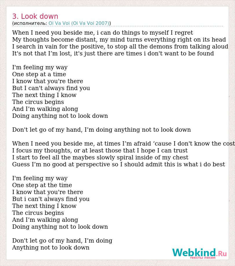When I need you beside me, i can do things to myself I regret My thoughts become distant, my mind turns everything right on its head I search in vain for the positive, to stop all the demons from talking aloud It's not that I’m lost, it's just there are times i don't want to be found I'm feeling my way One step at a time I know that you're there But I can't always find you The next thing I know The circus begins And I’m walking along Doing anything not to look down Don't let go of my hand, I’m doing anything not to look down When I need you beside me, at times I’m afraid ‘cause I don't know the cost I focus my thoughts, or at least those that I hope I can trust I start to feel all the maybes slowly spiral inside of my chest Guess I’m no good at perspective so I should admit this is what i do best I'm feeling my way One step at the time I know that you're there But i can't always find you The next thing I know The circus begins And I’m walking along Doing anything not to look down Don't let go of my hand, I’m doing Anything not to look down