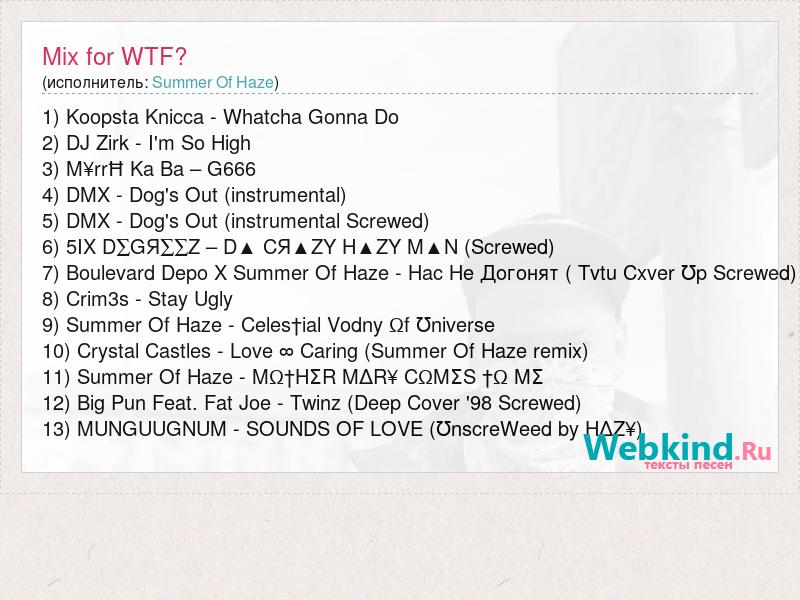 1) Koopsta Knicca - Whatcha Gonna Do 2) DJ Zirk - I'm So High 3) M¥rrĦ Ka Ba – G666 4) DMX - Dog's Out (instrumental) 5) DMX - Dog's Out (instrumental Screwed) 6) 5IX D∑GЯ∑∑Z – D▲ CЯ▲ZY H▲ZY M▲N (Screwed) 7) Boulevard Depo X Summer Of Haze - Нас Не Догонят ( Tvtu Cxver Ʊp Screwed) 8) Crim3s - Stay Ugly 9) Summer Of Haze - Celes†ial Vodny Ωf Ʊniverse 10) Crystal Castles - Love ∞ Caring (Summer Of Haze remix) 11) Summer Of Haze - MΩ†HƩR M∆R¥ CΩMƩS †Ω MƩ 12) Big Pun Feat. Fat Joe - Twinz (Deep Cover '98 Screwed) 13) MUNGUUGNUM - SOUNDS OF LOVE (ƱnscreWeed by H∆Z¥)