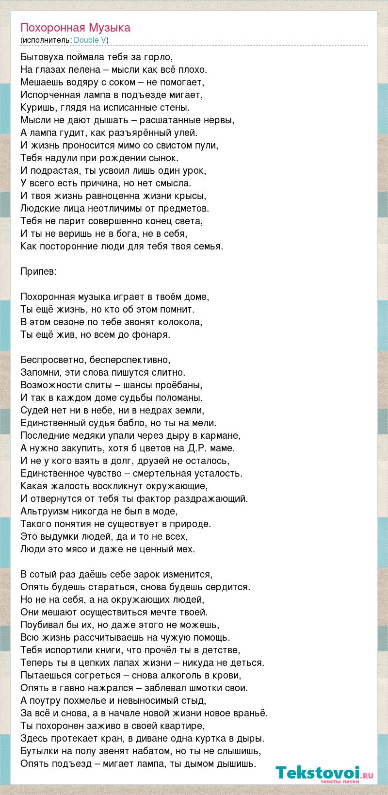 Бытовуха поймала тебя за горло, На глазах пелена – мысли как всё плохо. Мешаешь водяру с соком – не помогает, Испорченная лампа в подъезде мигает, Куришь, глядя на исписанные стены. Мысли не дают дышать – расшатанные нервы, А лампа гудит, как разъярённый улей. И жизнь проносится мимо со свистом пули, Тебя надули при рождении сынок. И подрастая, ты усвоил лишь один урок, У всего есть причина, но нет смысла. И твоя жизнь равноценна жизни крысы, Людские лица неотличимы от предметов. Тебя не парит совершенно конец света, И ты не веришь не в бога, не в себя, Как посторонние люди для тебя твоя семья. Припев: Похоронная музыка играет в твоём доме, Ты ещё жизнь, но кто об этом помнит. В этом сезоне по тебе звонят колокола, Ты ещё жив, но всем до фонаря. Беспросветно, бесперспективно, Запомни, эти слова пишутся слитно. Возможности слиты – шансы проёбаны, И так в каждом доме судьбы поломаны. Судей нет ни в небе, ни в недрах земли, Единственный судья бабло, но ты на мели. Последние медяки упали через дыру в кармане, А нужно закупить, хотя б цветов на Д.Р. маме. И не у кого взять в долг, друзей не осталось, Единственное чувство – смертельная усталость. Какая жалость воскликнут окружающие, И отвернутся от тебя ты фактор раздражающий. Альтруизм никогда не был в моде, Такого понятия не существует в природе. Это выдумки людей, да и то не всех, Люди это мясо и даже не ценный мех. В сотый раз даёшь себе зарок изменится, Опять будешь стараться, снова будешь сердится. Но не на себя, а на окружающих людей, Они мешают осуществиться мечте твоей. Поубивал бы их, но даже этого не можешь, Всю жизнь рассчитываешь на чужую помощь. Тебя испортили книги, что прочёл ты в детстве, Теперь ты в цепких лапах жизни – никуда не деться. Пытаешься согреться – снова алкоголь в крови, Опять в гавно нажрался – заблевал шмотки свои. А поутру похмелье и невыносимый стыд, За всё и снова, а в начале новой жизни новое враньё. Ты похоронен заживо в своей квартире, Здесь протекает кран, в диване одна куртка в дыры. Бутылки на полу звенят набатом, но ты не слышишь, Опять подъезд – мигает лампа, ты дымом дышишь.