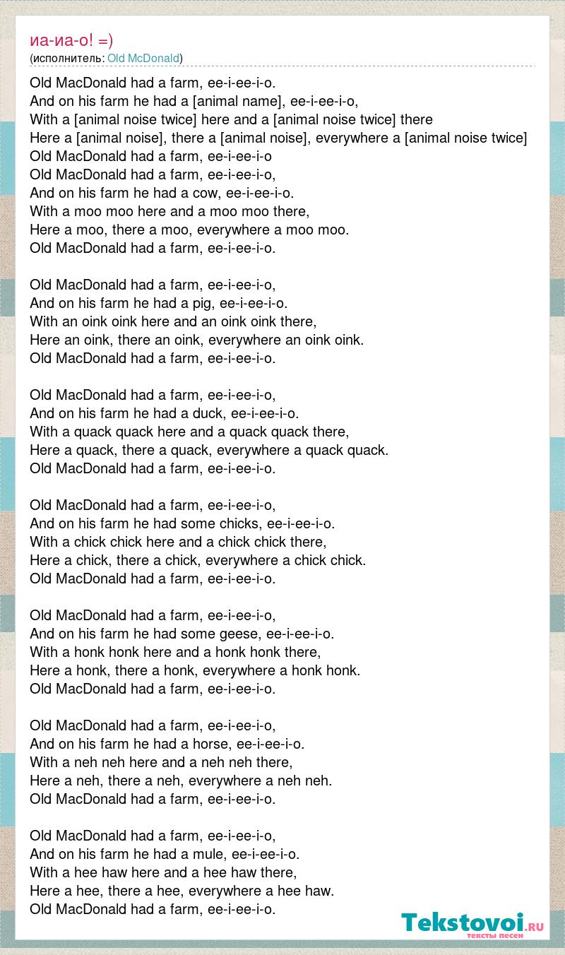 Old MacDonald had a farm, ee-i-ee-i-o. And on his farm he had a [animal name], ee-i-ee-i-o, With a [animal noise twice] here and a [animal noise twice] there Here a [animal noise], there a [animal noise], everywhere a [animal noise twice] Old MacDonald had a farm, ee-i-ee-i-o Old MacDonald had a farm, ee-i-ee-i-o, And on his farm he had a cow, ee-i-ee-i-o. With a moo moo here and a moo moo there, Here a moo, there a moo, everywhere a moo moo. Old MacDonald had a farm, ee-i-ee-i-o. Old MacDonald had a farm, ee-i-ee-i-o, And on his farm he had a pig, ee-i-ee-i-o. With an oink oink here and an oink oink there, Here an oink, there an oink, everywhere an oink oink. Old MacDonald had a farm, ee-i-ee-i-o. Old MacDonald had a farm, ee-i-ee-i-o, And on his farm he had a duck, ee-i-ee-i-o. With a quack quack here and a quack quack there, Here a quack, there a quack, everywhere a quack quack. Old MacDonald had a farm, ee-i-ee-i-o. Old MacDonald had a farm, ee-i-ee-i-o, And on his farm he had some chicks, ee-i-ee-i-o. With a chick chick here and a chick chick there, Here a chick, there a chick, everywhere a chick chick. Old MacDonald had a farm, ee-i-ee-i-o. Old MacDonald had a farm, ee-i-ee-i-o, And on his farm he had some geese, ee-i-ee-i-o. With a honk honk here and a honk honk there, Here a honk, there a honk, everywhere a honk honk. Old MacDonald had a farm, ee-i-ee-i-o. Old MacDonald had a farm, ee-i-ee-i-o, And on his farm he had a horse, ee-i-ee-i-o. With a neh neh here and a neh neh there, Here a neh, there a neh, everywhere a neh neh. Old MacDonald had a farm, ee-i-ee-i-o. Old MacDonald had a farm, ee-i-ee-i-o, And on his farm he had a mule, ee-i-ee-i-o. With a hee haw here and a hee haw there, Here a hee, there a hee, everywhere a hee haw. Old MacDonald had a farm, ee-i-ee-i-o.