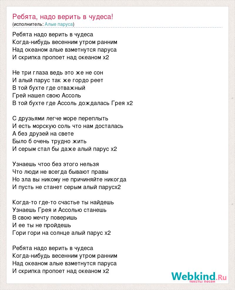 Ребята надо верить в чудеса Когда-нибудь весенним утром ранним Над океаном алые взметнутся паруса И скрипка пропоет над океаном х2 Не три глаза ведь это же не сон И алый парус так же гордо реет В той бухте где отважный Грей нашел свою Ассоль В той бухте где Ассоль дождалась Грея х2 С друзьями легче море переплыть И есть морскую соль что нам досталась А без друзей на свете Было б очень трудно жить И серым стал бы даже алый парус х2 Узнаешь чтоо без этого нельзя Что люди не всегда бывают правы Но зла вы никому не причиняйте никогда И пусть не станет серым алый парусх2 Когда-то где-то счастье ты найдешь Узнаешь Грея и Ассолью станешь В свою мечту поверишь И ее ты не пройдешь Гори гори на солнце алый парус х2 Ребята надо верить в чудеса Когда-нибудь весенним утром ранним Над океаном алые взметнутся паруса И скрипка пропоет над океаном х2