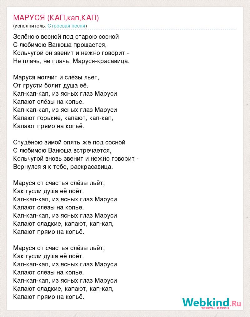 Зелёною весной под старою сосной С любимою Ванюша прощается, Кольчугой он звенит и нежно говорит - Не плачь, не плачь, Маруся-красавица. Маруся молчит и слёзы льёт, От грусти болит душа её. Кап-кап-кап, из ясных глаз Маруси Капают слёзы на копье. Кап-кап-кап, из ясных глаз Маруси Капают горькие, капают, кап-кап, Капают прямо на копьё. Студёною зимой опять же под сосной С любимою Ванюша встречается, Кольчугой вновь звенит и нежно говорит - Вернулся я к тебе, раскрасавица. Маруся от счастья слёзы льёт, Как гусли душа её поёт. Кап-кап-кап, из ясных глаз Маруси Капают слёзы на копье. Кап-кап-кап, из ясных глаз Маруси Капают сладкие, капают, кап-кап, Капают прямо на копьё. Маруся от счастья слёзы льёт, Как гусли душа её поёт. Кап-кап-кап, из ясных глаз Маруси Капают слёзы на копье. Кап-кап-кап, из ясных глаз Маруси Капают сладкие, капают, кап-кап, Капают прямо на копьё.