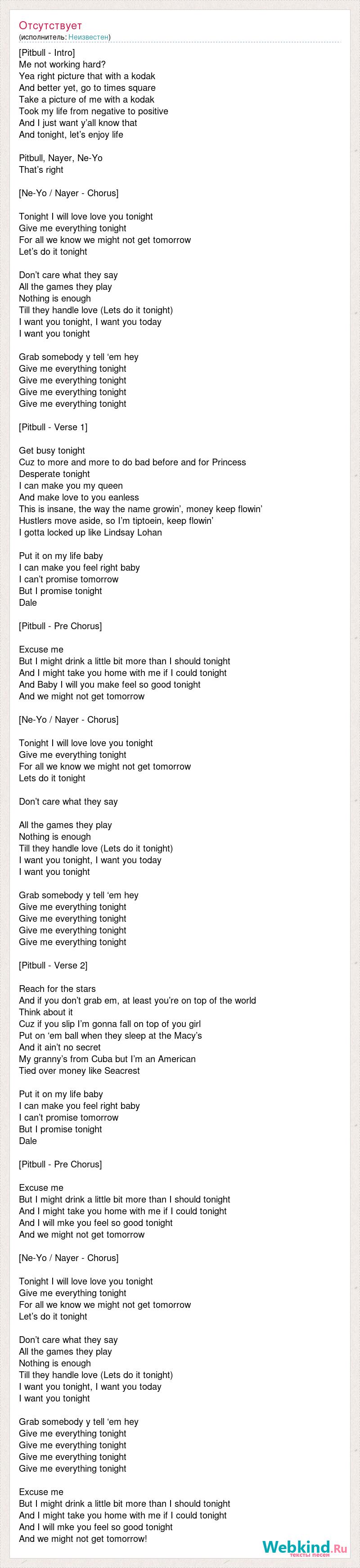 [Pitbull - Intro] Me not working hard? Yea right picture that with a kodak And better yet, go to times square Take a picture of me with a kodak Took my life from negative to positive And I just want y’all know that And tonight, let’s enjoy life Pitbull, Nayer, Ne-Yo That’s right [Ne-Yo / Nayer - Chorus] Tonight I will love love you tonight Give me everything tonight For all we know we might not get tomorrow Let’s do it tonight Don’t care what they say All the games they play Nothing is enough Till they handle love (Lets do it tonight) I want you tonight, I want you today I want you tonight Grab somebody y tell ‘em hey Give me everything tonight Give me everything tonight Give me everything tonight Give me everything tonight [Pitbull - Verse 1] Get busy tonight Cuz to more and more to do bad before and for Princess Desperate tonight I can make you my queen And make love to you eanless This is insane, the way the name growin’, money keep flowin’ Hustlers move aside, so I’m tiptoein, keep flowin’ I gotta locked up like Lindsay Lohan Put it on my life baby I can make you feel right baby I can’t promise tomorrow But I promise tonight Dale [Pitbull - Pre Chorus] Excuse me But I might drink a little bit more than I should tonight And I might take you home with me if I could tonight And Baby I will you make feel so good tonight And we might not get tomorrow [Ne-Yo / Nayer - Chorus] Tonight I will love love you tonight Give me everything tonight For all we know we might not get tomorrow Lets do it tonight Don’t care what they say All the games they play Nothing is enough Till they handle love (Lets do it tonight) I want you tonight, I want you today I want you tonight Grab somebody y tell ‘em hey Give me everything tonight Give me everything tonight Give me everything tonight Give me everything tonight [Pitbull - Verse 2] Reach for the stars And if you don’t grab em, at least you’re on top of the world Think about it Cuz if you slip I’m gonna fall on top of you girl Put on ‘em ball when they sleep at the Macy’s And it ain’t no secret My granny’s from Cuba but I’m an American Tied over money like Seacrest Put it on my life baby I can make you feel right baby I can’t promise tomorrow But I promise tonight Dale [Pitbull - Pre Chorus] Excuse me But I might drink a little bit more than I should tonight And I might take you home with me if I could tonight And I will mke you feel so good tonight And we might not get tomorrow [Ne-Yo / Nayer - Chorus] Tonight I will love love you tonight Give me everything tonight For all we know we might not get tomorrow Let’s do it tonight Don’t care what they say All the games they play Nothing is enough Till they handle love (Lets do it tonight) I want you tonight, I want you today I want you tonight Grab somebody y tell ‘em hey Give me everything tonight Give me everything tonight Give me everything tonight Give me everything tonight Excuse me But I might drink a little bit more than I should tonight And I might take you home with me if I could tonight And I will mke you feel so good tonight And we might not get tomorrow!
