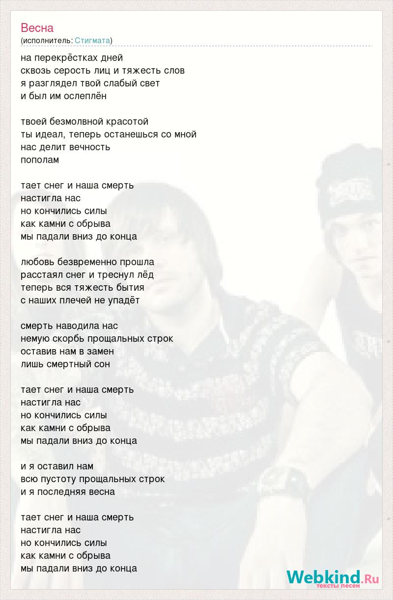 на перекрёстках дней сквозь серость лиц и тяжесть слов я разглядел твой слабый свет и был им ослеплён твоей безмолвной красотой ты идеал, теперь останешься со мной нас делит вечность пополам тает снег и наша смерть настигла нас но кончились силы как камни с обрыва мы падали вниз до конца любовь безвременно прошла расстаял снег и треснул лёд теперь вся тяжесть бытия с наших плечей не упадёт смерть наводила нас немую скорбь прощальных строк оставив нам в замен лишь смертный сон тает снег и наша смерть настигла нас но кончились силы как камни с обрыва мы падали вниз до конца и я оставил нам всю пустоту прощальных строк и я последняя весна тает снег и наша смерть настигла нас но кончились силы как камни с обрыва мы падали вниз до конца