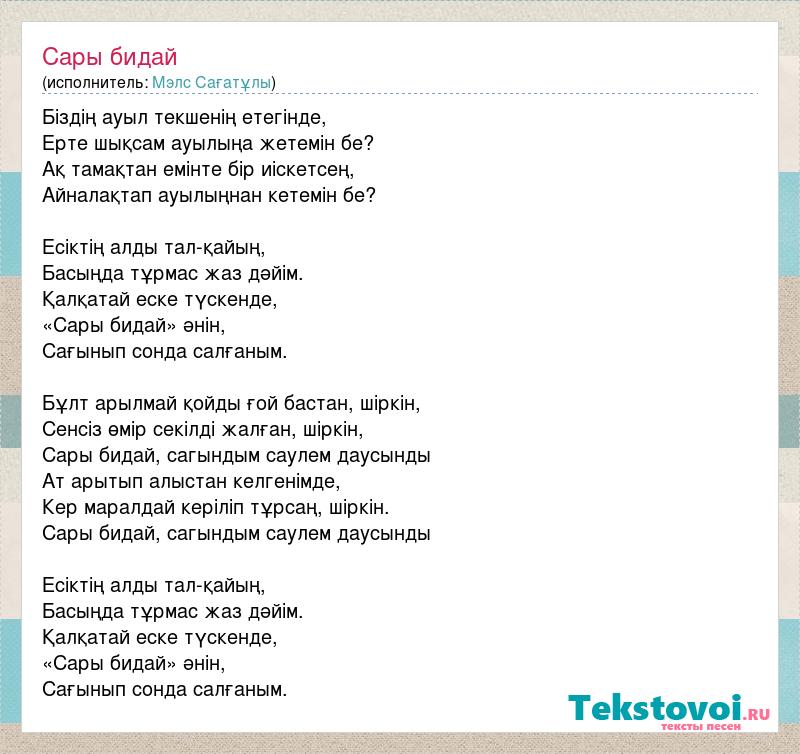 Біздің ауыл текшенің етегінде, Ерте шықсам ауылыңа жетемін бе? Ақ тамақтан емінте бір иіскетсең, Айналақтап ауылыңнан кетемін бе? Есіктің алды тал-қайың, Басыңда тұрмас жаз дәйім. Қалқатай еске түскенде, «Сары бидай» әнін, Сағынып сонда салғаным. Бұлт арылмай қойды ғой бастан, шіркін, Сенсіз өмір секілді жалған, шіркін, Сары бидай, сагындым саулем даусынды Ат арытып алыстан келгенімде, Кер маралдай керіліп тұрсаң, шіркін. Сары бидай, сагындым саулем даусынды Есіктің алды тал-қайың, Басыңда тұрмас жаз дәйім. Қалқатай еске түскенде, «Сары бидай» әнін, Сағынып сонда салғаным.