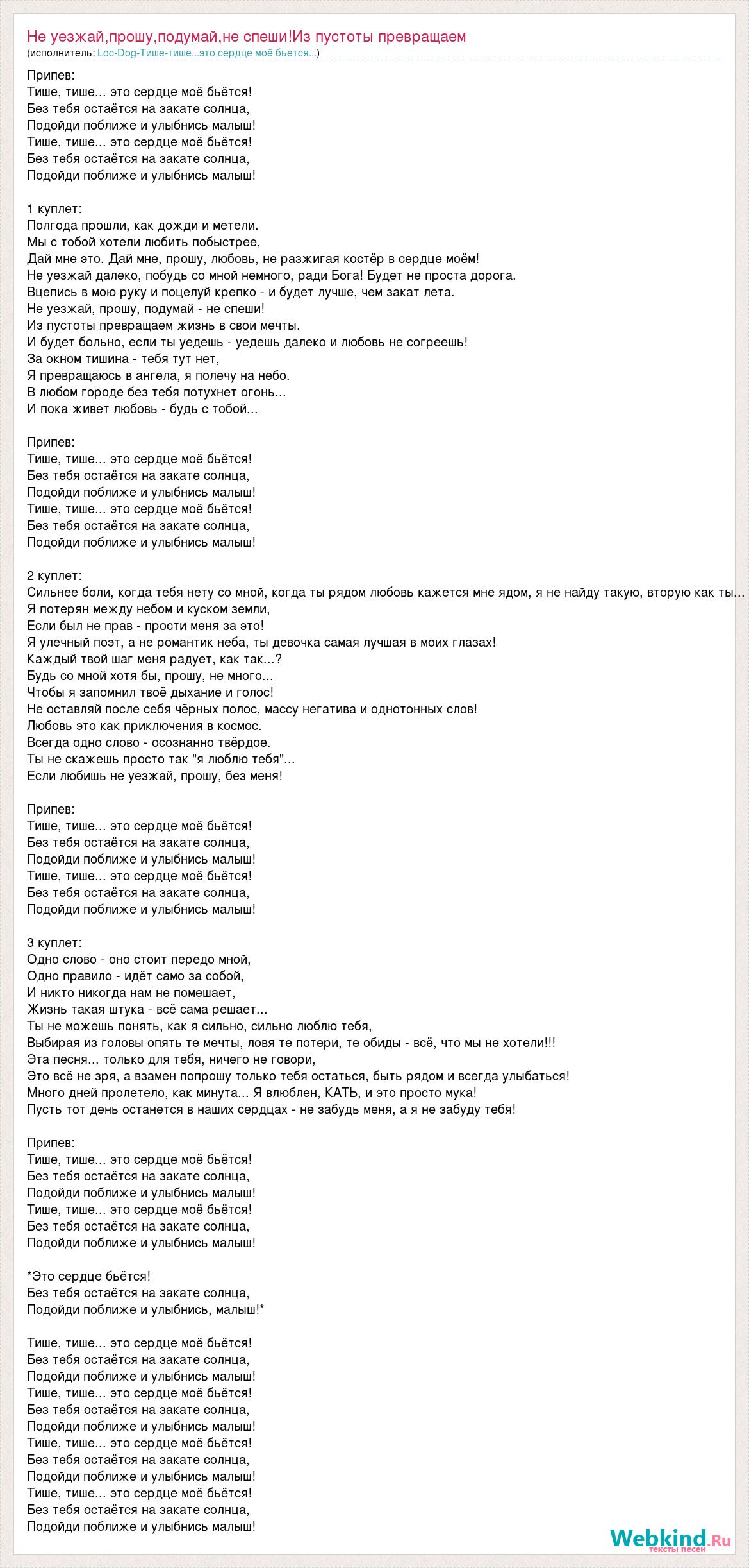 Припев: Тише, тише... это сердце моё бьётся! Без тебя остаётся на закате солнца, Подойди поближе и улыбнись малыш! Тише, тише... это сердце моё бьётся! Без тебя остаётся на закате солнца, Подойди поближе и улыбнись малыш! 1 куплет: Полгода прошли, как дожди и метели. Мы с тобой хотели любить побыстрее, Дай мне это. Дай мне, прошу, любовь, не разжигая костёр в сердце моём! Не уезжай далеко, побудь со мной немного, ради Бога! Будет не проста дорога. Вцепись в мою руку и поцелуй крепко - и будет лучше, чем закат лета. Не уезжай, прошу, подумай - не спеши! Из пустоты превращаем жизнь в свои мечты. И будет больно, если ты уедешь - уедешь далеко и любовь не согреешь! За окном тишина - тебя тут нет, Я превращаюсь в ангела, я полечу на небо. В любом городе без тебя потухнет огонь... И пока живет любовь - будь с тобой... Припев: Тише, тише... это сердце моё бьётся! Без тебя остаётся на закате солнца, Подойди поближе и улыбнись малыш! Тише, тише... это сердце моё бьётся! Без тебя остаётся на закате солнца, Подойди поближе и улыбнись малыш! 2 куплет: Сильнее боли, когда тебя нету со мной, когда ты рядом любовь кажется мне ядом, я не найду такую, вторую как ты... Я потерян между небом и куском земли, Если был не прав - прости меня за это! Я улечный поэт, а не романтик неба, ты девочка самая лучшая в моих глазах! Каждый твой шаг меня радует, как так...? Будь со мной хотя бы, прошу, не много... Чтобы я запомнил твоё дыхание и голос! Не оставляй после себя чёрных полос, массу негатива и однотонных слов! Любовь это как приключения в космос. Всегда одно слово - осознанно твёрдое. Ты не скажешь просто так "я люблю тебя"... Если любишь не уезжай, прошу, без меня! Припев: Тише, тише... это сердце моё бьётся! Без тебя остаётся на закате солнца, Подойди поближе и улыбнись малыш! Тише, тише... это сердце моё бьётся! Без тебя остаётся на закате солнца, Подойди поближе и улыбнись малыш! 3 куплет: Одно слово - оно стоит передо мной, Одно правило - идёт само за собой, И никто никогда нам не помешает, Жизнь такая штука - всё сама решает... Ты не можешь понять, как я сильно, сильно люблю тебя, Выбирая из головы опять те мечты, ловя те потери, те обиды - всё, что мы не хотели!!! Эта песня... только для тебя, ничего не говори, Это всё не зря, а взамен попрошу только тебя остаться, быть рядом и всегда улыбаться! Много дней пролетело, как минута... Я влюблен, КАТЬ, и это просто мука! Пусть тот день останется в наших сердцах - не забудь меня, а я не забуду тебя! Припев: Тише, тише... это сердце моё бьётся! Без тебя остаётся на закате солнца, Подойди поближе и улыбнись малыш! Тише, тише... это сердце моё бьётся! Без тебя остаётся на закате солнца, Подойди поближе и улыбнись малыш! *Это сердце бьётся! Без тебя остаётся на закате солнца, Подойди поближе и улыбнись, малыш!* Тише, тише... это сердце моё бьётся! Без тебя остаётся на закате солнца, Подойди поближе и улыбнись малыш! Тише, тише... это сердце моё бьётся! Без тебя остаётся на закате солнца, Подойди поближе и улыбнись малыш! Тише, тише... это сердце моё бьётся! Без тебя остаётся на закате солнца, Подойди поближе и улыбнись малыш! Тише, тише... это сердце моё бьётся! Без тебя остаётся на закате солнца, Подойди поближе и улыбнись малыш!