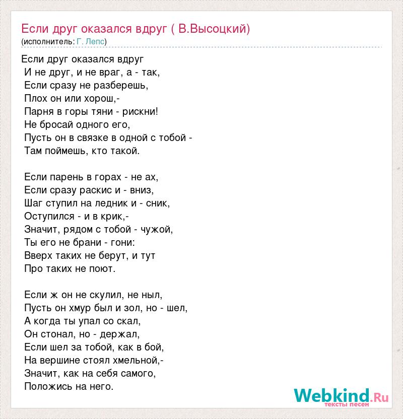 Если друг оказался вдруг И не друг, и не враг, а - так, Если сразу не разберешь, Плох он или хорош,- Парня в горы тяни - рискни! Не бросай одного его, Пусть он в связке в одной с тобой - Там поймешь, кто такой. Если парень в горах - не ах, Если сразу раскис и - вниз, Шаг ступил на ледник и - сник, Оступился - и в крик,- Значит, рядом с тобой - чужой, Ты его не брани - гони: Вверх таких не берут, и тут Про таких не поют. Если ж он не скулил, не ныл, Пусть он хмур был и зол, но - шел, А когда ты упал со скал, Он стонал, но - держал, Если шел за тобой, как в бой, На вершине стоял хмельной,- Значит, как на себя самого, Положись на него.