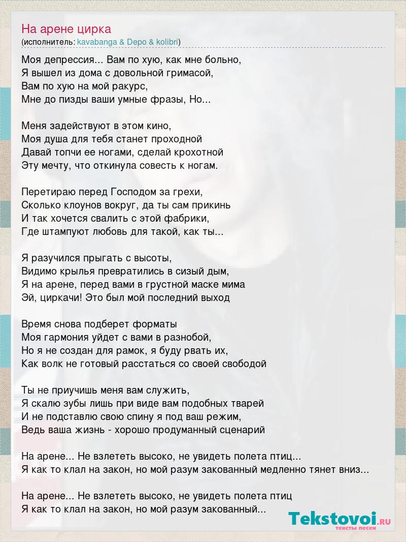 Моя депрессия... Вам по хую, как мне больно, Я вышел из дома с довольной гримасой, Вам по хую на мой ракурс, Мне до пизды ваши умные фразы, Но... Меня задействуют в этом кино, Моя душа для тебя станет проходной Давай топчи ее ногами, сделай крохотной Эту мечту, что откинула совесть к ногам. Перетираю перед Господом за грехи, Сколько клоунов вокруг, да ты сам прикинь И так хочется свалить с этой фабрики, Где штампуют любовь для такой, как ты... Я разучился прыгать с высоты, Видимо крылья превратились в сизый дым, Я на арене, перед вами в грустной маске мима Эй, циркачи! Это был мой последний выход Время снова подберет форматы Моя гармония уйдет с вами в разнобой, Но я не создан для рамок, я буду рвать их, Как волк не готовый расстаться со своей свободой Ты не приучишь меня вам служить, Я скалю зубы лишь при виде вам подобных тварей И не подставлю свою спину я под ваш режим, Ведь ваша жизнь - хорошо продуманный сценарий На арене... Не взлететь высоко, не увидеть полета птиц... Я как то клал на закон, но мой разум закованный медленно тянет вниз... На арене... Не взлететь высоко, не увидеть полета птиц Я как то клал на закон, но мой разум закованный...