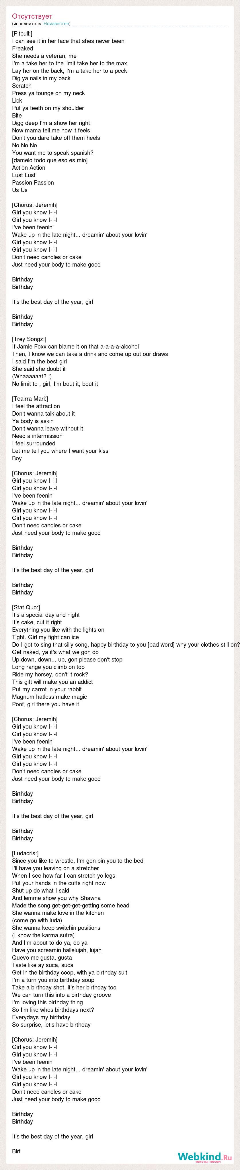 [Pitbull:] I can see it in her face that shes never been Freaked She needs a veteran, me I'm a take her to the limit take her to the max Lay her on the back, I'm a take her to a peek Dig ya nails in my back Scratch Press ya tounge on my neck Lick Put ya teeth on my shoulder Bite Digg deep I'm a show her right Now mama tell me how it feels Don't you dare take off them heels No No No You want me to speak spanish? [damelo todo que eso es mio] Action Action Lust Lust Passion Passion Us Us [Chorus: Jeremih] Girl you know I-I-I Girl you know I-I-I I've been feenin' Wake up in the late night... dreamin' about your lovin' Girl you know I-I-I Girl you know I-I-I Don't need candles or cake Just need your body to make good Birthday Birthday It's the best day of the year, girl Birthday Birthday [Trey Songz:] If Jamie Foxx can blame it on that a-a-a-a-alcohol Then, I know we can take a drink and come up out our draws I said I'm the best girl She said she doubt it (Whaaaaaat? !) No limit to , girl, I'm bout it, bout it [Teairra Mari:] I feel the attraction Don't wanna talk about it Ya body is askin Don't wanna leave without it Need a intermission I feel surrounded Let me tell you where I want your kiss Boy [Chorus: Jeremih] Girl you know I-I-I Girl you know I-I-I I've been feenin' Wake up in the late night... dreamin' about your lovin' Girl you know I-I-I Girl you know I-I-I Don't need candles or cake Just need your body to make good Birthday Birthday It's the best day of the year, girl Birthday Birthday [Stat Quo:] It's a special day and night It's cake, cut it right Everything you like with the lights on Tight. Girl my fight can ice Do I got to sing that silly song, happy birthday to you [bad word] why your clothes still on? Get naked, ya it's what we gon do Up down, down... up, gon please don't stop Long range you climb on top Ride my horsey, don't it rock? This gift will make you an addict Put my carrot in your rabbit Magnum hatless make magic Poof, girl there you have it [Chorus: Jeremih] Girl you know I-I-I Girl you know I-I-I I've been feenin' Wake up in the late night... dreamin' about your lovin' Girl you know I-I-I Girl you know I-I-I Don't need candles or cake Just need your body to make good Birthday Birthday It's the best day of the year, girl Birthday Birthday [Ludacris:] Since you like to wrestle, I'm gon pin you to the bed I'll have you leaving on a stretcher When I see how far I can stretch yo legs Put your hands in the cuffs right now Shut up do what I said And lemme show you why Shawna Made the song get-get-get-getting some head She wanna make love in the kitchen (come go with luda) She wanna keep switchin positions (I know the karma sutra) And I'm about to do ya, do ya Have you screamin hallelujah, lujah Quevo me gusta, gusta Taste like ay suca, suca Get in the birthday coop, with ya birthday suit I'm a turn you into birthday soup Take a birthday shot, it's her birthday too We can turn this into a birthday groove I'm loving this birthday thing So I'm like whos birthdays next? Everydays my birthday So surprise, let's have birthday [Chorus: Jeremih] Girl you know I-I-I Girl you know I-I-I I've been feenin' Wake up in the late night... dreamin' about your lovin' Girl you know I-I-I Girl you know I-I-I Don't need candles or cake Just need your body to make good Birthday Birthday It's the best day of the year, girl Birt