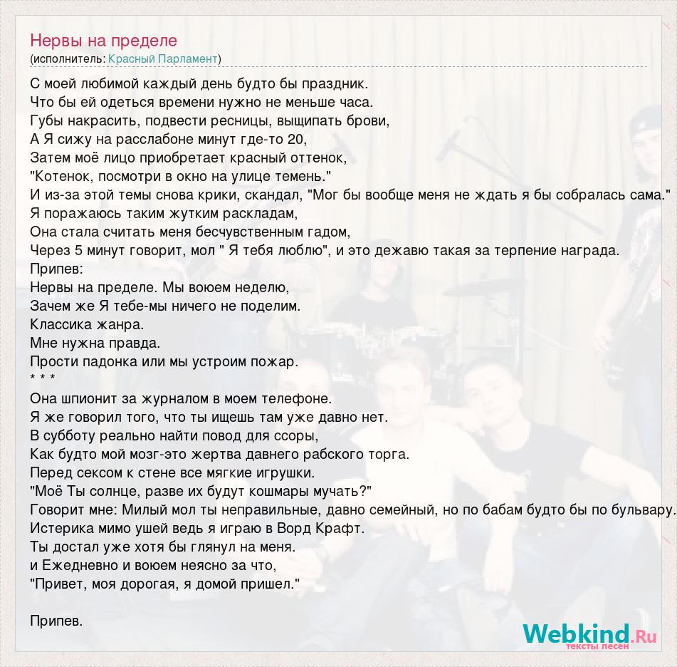 С моей любимой каждый день будто бы праздник. Что бы ей одеться времени нужно не меньше часа. Губы накрасить, подвести ресницы, выщипать брови, А Я сижу на расслабоне минут где-то 20, Затем моё лицо приобретает красный оттенок, "Котенок, посмотри в окно на улице темень." И из-за этой темы снова крики, скандал, "Мог бы вообще меня не ждать я бы собралась сама." Я поражаюсь таким жутким раскладам, Она стала считать меня бесчувственным гадом, Через 5 минут говорит, мол " Я тебя люблю", и это дежавю такая за терпение награда. Припев: Нервы на пределе. Мы воюем неделю, Зачем же Я тебе-мы ничего не поделим. Классика жанра. Мне нужна правда. Прости падонка или мы устроим пожар. * * * Она шпионит за журналом в моем телефоне. Я же говорил того, что ты ищешь там уже давно нет. В субботу реально найти повод для ссоры, Как будто мой мозг-это жертва давнего рабского торга. Перед сексом к стене все мягкие игрушки. "Моё Ты солнце, разве их будут кошмары мучать?" Говорит мне: Милый мол ты неправильные, давно семейный, но по бабам будто бы по бульвару. Истерика мимо ушей ведь я играю в Ворд Крафт. Ты достал уже хотя бы глянул на меня. и Ежедневно и воюем неясно за что, "Привет, моя дорогая, я домой пришел." Припев.