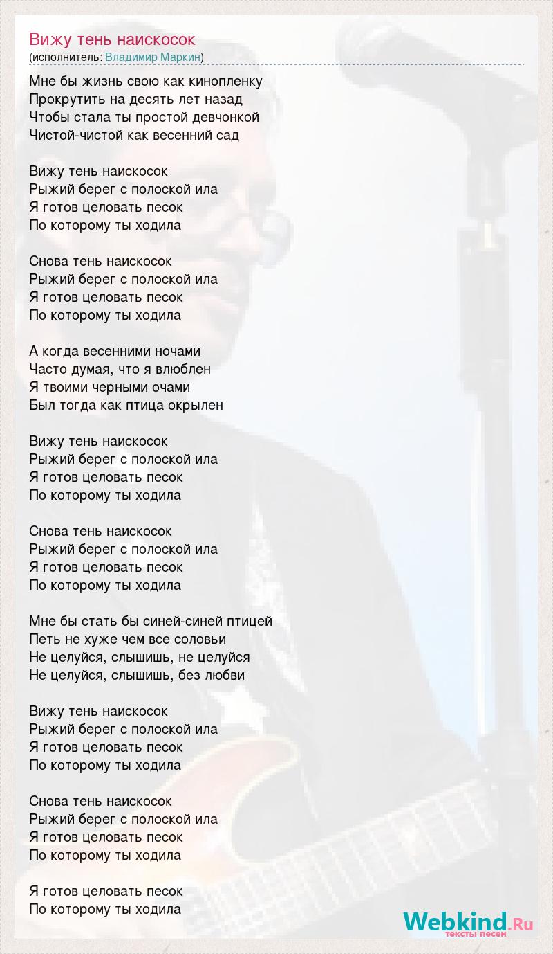 Мне бы жизнь свою как кинопленку Прокрутить на десять лет назад Чтобы стала ты простой девчонкой Чистой-чистой как весенний сад Вижу тень наискосок Рыжий берег с полоской ила Я готов целовать песок По которому ты ходила Снова тень наискосок Рыжий берег с полоской ила Я готов целовать песок По которому ты ходила А когда весенними ночами Часто думая, что я влюблен Я твоими черными очами Был тогда как птица окрылен Вижу тень наискосок Рыжий берег с полоской ила Я готов целовать песок По которому ты ходила Снова тень наискосок Рыжий берег с полоской ила Я готов целовать песок По которому ты ходила Мне бы стать бы синей-синей птицей Петь не хуже чем все соловьи Не целуйся, слышишь, не целуйся Не целуйся, слышишь, без любви Вижу тень наискосок Рыжий берег с полоской ила Я готов целовать песок По которому ты ходила Снова тень наискосок Рыжий берег с полоской ила Я готов целовать песок По которому ты ходила Я готов целовать песок По которому ты ходила