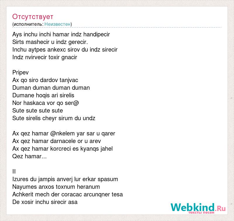 Ays inchu inchi hamar indz handipecir Sirts mashecir u indz gerecir. Inchu aytpes ankexc sirov du indz sirecir Indz nvirvecir toxir gnacir Pripev Ax qo siro dardov tanjvac Duman duman duman duman Dumane hoqis ari sirelis Nor haskaca vor qo ser@ Sute sute sute sute Sute sirelis cheyr sirum du undz Ax qez hamar @nkelem yar sar u qarer Ax qez hamar darnacele or u arev Ax qez hamar korcreci es kyanqs jahel Qez hamar... II Izures du jampis anverj lur erkar spasum Nayumes anxos toxnum heranum Achkerit mech der coracac arcunqner tesa De xosir inchu sirecir asa