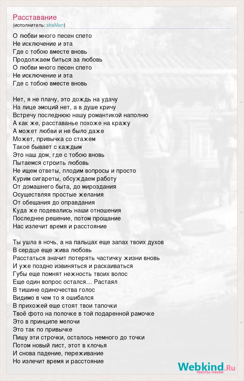 О любви много песен спето Не исключение и эта Где с тобою вместе вновь Продолжаем биться за любовь О любви много песен спето Не исключение и эта Где с тобою вместе вновь Нет, я не плачу, это дождь на удачу На лице эмоций нет, а в душе кричу Встречу последнюю нашу романтикой наполню А как же, расставанье похоже на кражу А может любви и не было даже Может, привычка со стажем Такое бывает с каждым Это наш дом, где с тобою вновь Пытаемся строить любовь Не ищем ответы, плодим вопросы и просто Курим сигареты, обсуждаем работу От домашнего быта, до мироздания Осуществляя простые желания От обещания до оправдания Куда же подевались наши отношения Последнее решение, потом прощание Нас излечит время и расстояние Ты ушла в ночь, а на пальцах еще запах твоих духов В сердце еще жива любовь Расстаться значит потерять частичку жизни вновь И уже поздно извиняться и раскаиваться Губы еще помнят нежность твоих волос Еще один вопрос остался… Растаял В тишине одиночества голос Видимо в чем то я ошибался В прихожей еще стоят твои тапочки Твоё фото на полочке в той подаренной рамочке Это в принципе мелочи Это так по привычке Пишу эти строчки, осталось немного до точки Потом новый лист, этот в клочья И снова падение, переживание Но излечит время и расстояние