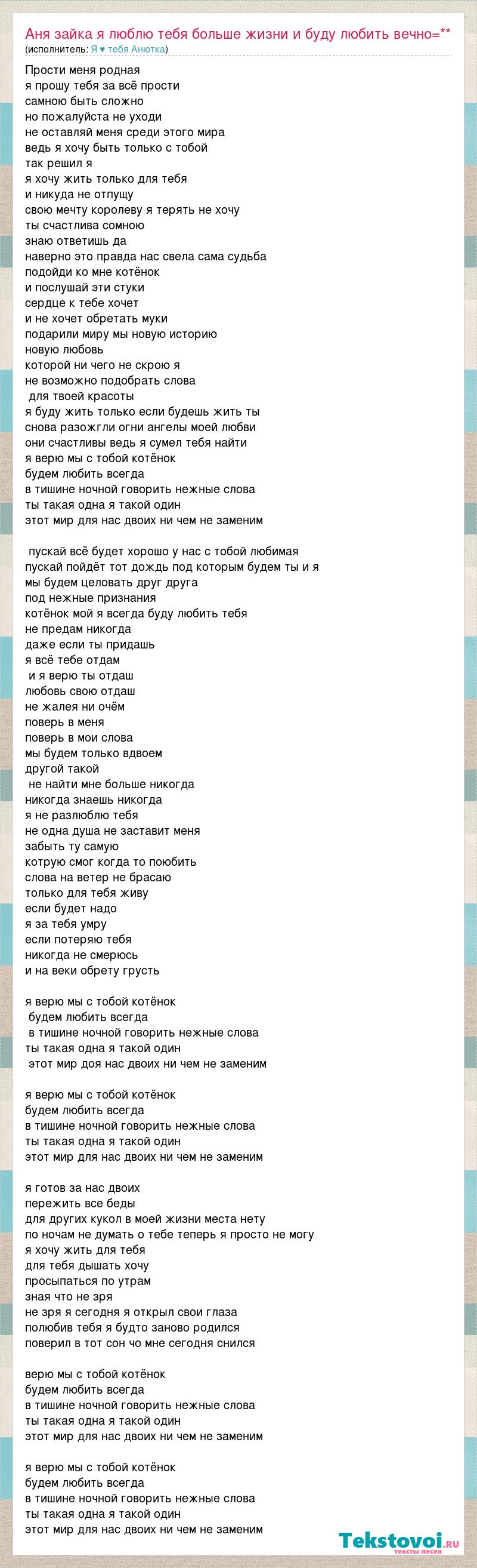 Прости меня родная я прошу тебя за всё прости самною быть сложно но пожалуйста не уходи не оставляй меня среди этого мира ведь я хочу быть только с тобой так решил я я хочу жить только для тебя и никуда не отпущу свою мечту королеву я терять не хочу ты счастлива сомною знаю ответишь да наверно это правда нас свела сама судьба подойди ко мне котёнок и послушай эти стуки сердце к тебе хочет и не хочет обретать муки подарили миру мы новую историю новую любовь которой ни чего не скрою я не возможно подобрать слова для твоей красоты я буду жить только если будешь жить ты снова разожгли огни ангелы моей любви они счастливы ведь я сумел тебя найти я верю мы с тобой котёнок будем любить всегда в тишине ночной говорить нежные слова ты такая одна я такой один этот мир для нас двоих ни чем не заменим пускай всё будет хорошо у нас с тобой любимая пускай пойдёт тот дождь под которым будем ты и я мы будем целовать друг друга под нежные признания котёнок мой я всегда буду любить тебя не предам никогда даже если ты придашь я всё тебе отдам и я верю ты отдаш любовь свою отдаш не жалея ни очём поверь в меня поверь в мои слова мы будем только вдвоем другой такой не найти мне больше никогда никогда знаешь никогда я не разлюблю тебя не одна душа не заставит меня забыть ту самую котрую смог когда то поюбить слова на ветер не брасаю только для тебя живу если будет надо я за тебя умру если потеряю тебя никогда не смерюсь и на веки обрету грусть я верю мы с тобой котёнок будем любить всегда в тишине ночной говорить нежные слова ты такая одна я такой один этот мир доя нас двоих ни чем не заменим я верю мы с тобой котёнок будем любить всегда в тишине ночной говорить нежные слова ты такая одна я такой один этот мир для нас двоих ни чем не заменим я готов за нас двоих пережить все беды для других кукол в моей жизни места нету по ночам не думать о тебе теперь я просто не могу я хочу жить для тебя для тебя дышать хочу просыпаться по утрам зная что не зря не зря я сегодня я открыл свои глаза полюбив тебя я будто заново родился поверил в тот сон чо мне сегодня снился верю мы с тобой котёнок будем любить всегда в тишине ночной говорить нежные слова ты такая одна я такой один этот мир для нас двоих ни чем не заменим я верю мы с тобой котёнок будем любить всегда в тишине ночной говорить нежные слова ты такая одна я такой один этот мир для нас двоих ни чем не заменим