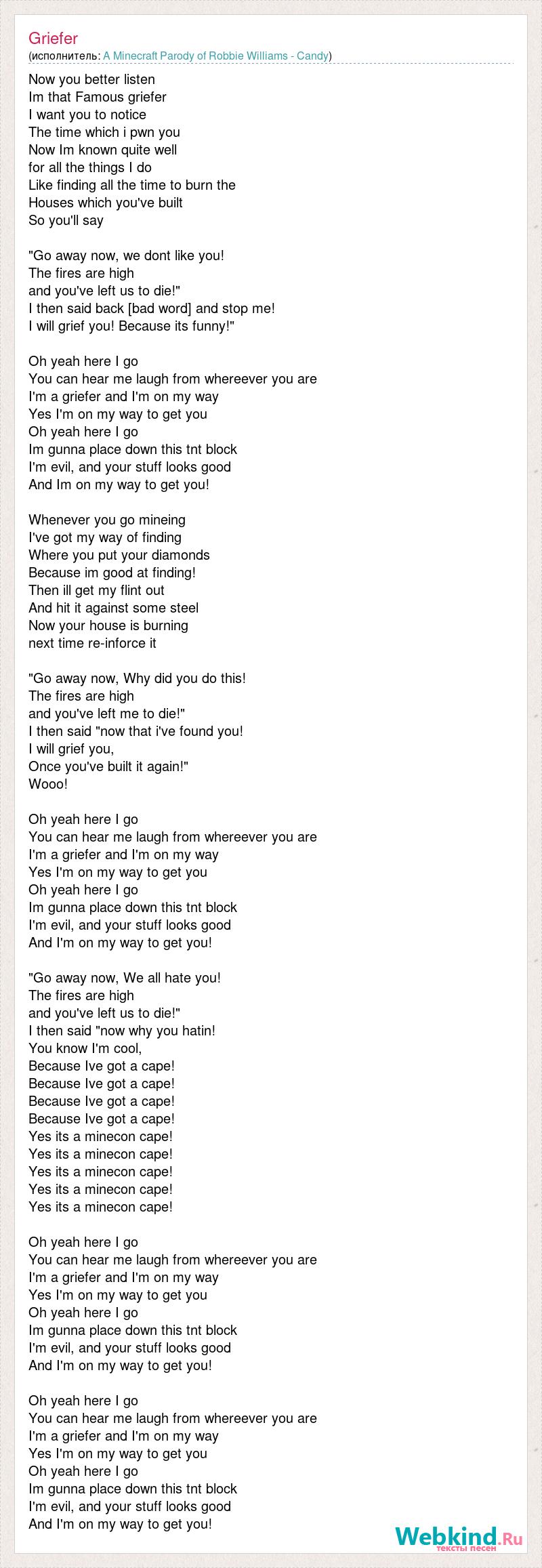 Now you better listen Im that Famous griefer I want you to notice The time which i pwn you Now Im known quite well for all the things I do Like finding all the time to burn the Houses which you've built So you'll say "Go away now, we dont like you! The fires are high and you've left us to die!" I then said back [bad word] and stop me! I will grief you! Because its funny!" Oh yeah here I go You can hear me laugh from whereever you are I'm a griefer and I'm on my way Yes I'm on my way to get you Oh yeah here I go Im gunna place down this tnt block I'm evil, and your stuff looks good And Im on my way to get you! Whenever you go mineing I've got my way of finding Where you put your diamonds Because im good at finding! Then ill get my flint out And hit it against some steel Now your house is burning next time re-inforce it "Go away now, Why did you do this! The fires are high and you've left me to die!" I then said "now that i've found you! I will grief you, Once you've built it again!" Wooo! Oh yeah here I go You can hear me laugh from whereever you are I'm a griefer and I'm on my way Yes I'm on my way to get you Oh yeah here I go Im gunna place down this tnt block I'm evil, and your stuff looks good And I'm on my way to get you! "Go away now, We all hate you! The fires are high and you've left us to die!" I then said "now why you hatin! You know I'm cool, Because Ive got a cape! Because Ive got a cape! Because Ive got a cape! Because Ive got a cape! Yes its a minecon cape! Yes its a minecon cape! Yes its a minecon cape! Yes its a minecon cape! Yes its a minecon cape! Oh yeah here I go You can hear me laugh from whereever you are I'm a griefer and I'm on my way Yes I'm on my way to get you Oh yeah here I go Im gunna place down this tnt block I'm evil, and your stuff looks good And I'm on my way to get you! Oh yeah here I go You can hear me laugh from whereever you are I'm a griefer and I'm on my way Yes I'm on my way to get you Oh yeah here I go Im gunna place down this tnt block I'm evil, and your stuff looks good And I'm on my way to get you!