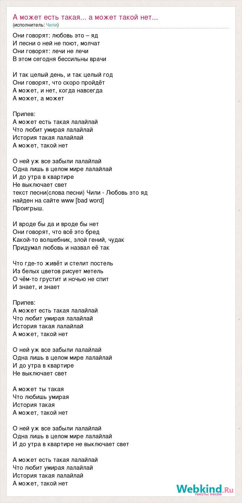 Они говорят: любовь это – яд И песни о ней не поют, молчат Они говорят: лечи не лечи В этом сегодня бессильны врачи И так целый день, и так целый год Они говорят, что скоро пройдёт А может, и нет, когда навсегда А может, а может Припев: А может есть такая лалайлай Что любит умирая лалайлай История такая лалайлай А может, такой нет О ней уж все забыли лалайлай Одна лишь в целом мире лалайлай И до утра в квартире Не выключает свет текст песни(слова песни) Чили - Любовь это яд найден на сайте www [bad word] Проигрыш. И вроде бы да и вроде бы нет Они говорят, что всё это бред Какой-то волшебник, злой гений, чудак Придумал любовь и назвал её так Что где-то живёт и стелит постель Из белых цветов рисует метель О чём-то грустит и ночью не спит И знает, и знает Припев: А может есть такая лалайлай Что любит умирая лалайлай История такая лалайлай А может, такой нет О ней уж все забыли лалайлай Одна лишь в целом мире лалайлай И до утра в квартире Не выключает свет А может ты такая Что любишь умирая История такая А может, такой нет О ней уж все забыли лалайлай Одна лишь в целом мире лалайлай И до утра в квартире не выключает свет А может есть такая лалайлай Что любит умирая лалайлай История такая лалайлай А может, такой нет