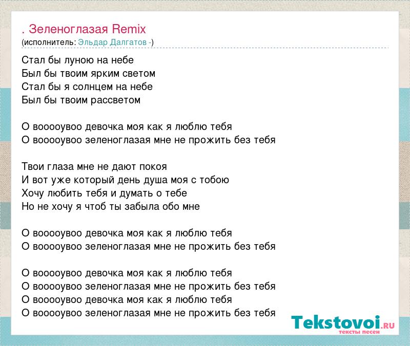 Стал бы луною на небе Был бы твоим ярким светом Стал бы я солнцем на небе Был бы твоим рассветом О вооооувоо девочка моя как я люблю тебя О вооооувоо зеленоглазая мне не прожить без тебя Твои глаза мне не дают покоя И вот уже который день душа моя с тобою Хочу любить тебя и думать о тебе Но не хочу я чтоб ты забыла обо мне О вооооувоо девочка моя как я люблю тебя О вооооувоо зеленоглазая мне не прожить без тебя О вооооувоо девочка моя как я люблю тебя О вооооувоо зеленоглазая мне не прожить без тебя О вооооувоо девочка моя как я люблю тебя О вооооувоо зеленоглазая мне не прожить без тебя