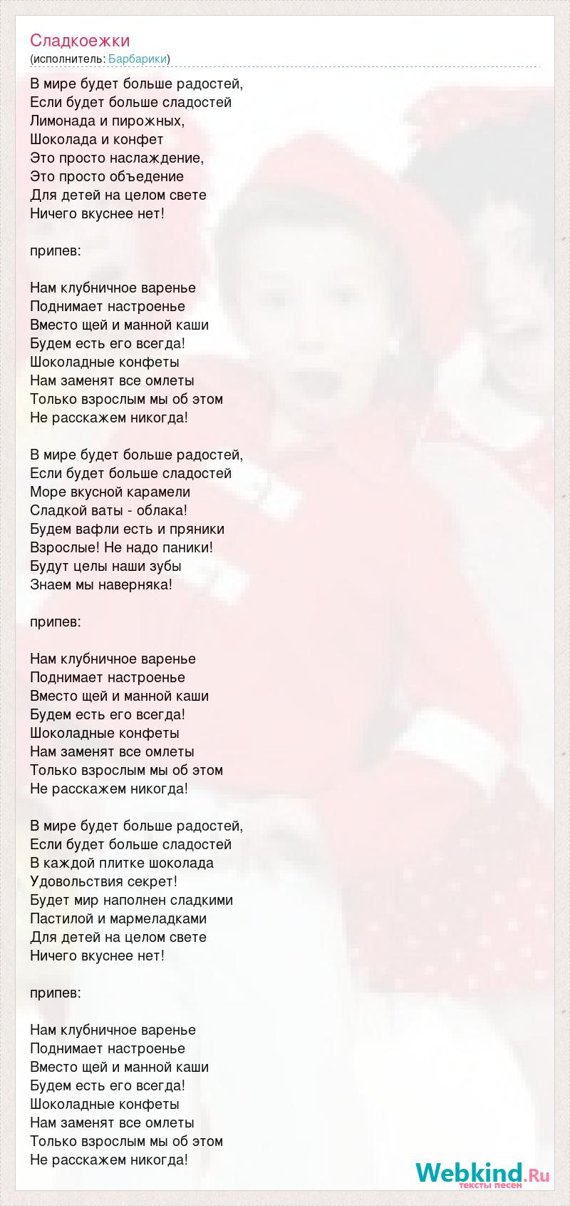 В мире будет больше радостей, Если будет больше сладостей Лимонада и пирожных, Шоколада и конфет Это просто наслаждение, Это просто объедение Для детей на целом свете Ничего вкуснее нет! припев: Нам клубничное варенье Поднимает настроенье Вместо щей и манной каши Будем есть его всегда! Шоколадные конфеты Нам заменят все омлеты Только взрослым мы об этом Не расскажем никогда! В мире будет больше радостей, Если будет больше сладостей Море вкусной карамели Сладкой ваты - облака! Будем вафли есть и пряники Взрослые! Не надо паники! Будут целы наши зубы Знаем мы наверняка! припев: Нам клубничное варенье Поднимает настроенье Вместо щей и манной каши Будем есть его всегда! Шоколадные конфеты Нам заменят все омлеты Только взрослым мы об этом Не расскажем никогда! В мире будет больше радостей, Если будет больше сладостей В каждой плитке шоколада Удовольствия секрет! Будет мир наполнен сладкими Пастилой и мармеладками Для детей на целом свете Ничего вкуснее нет! припев: Нам клубничное варенье Поднимает настроенье Вместо щей и манной каши Будем есть его всегда! Шоколадные конфеты Нам заменят все омлеты Только взрослым мы об этом Не расскажем никогда!
