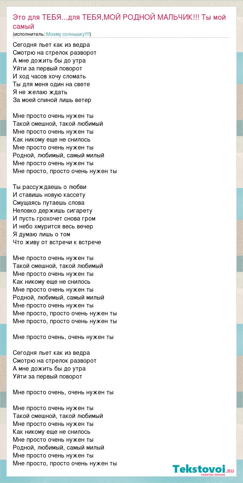 Сегодня льет как из ведра Смотрю на стрелок разворот А мне дожить бы до утра Уйти за первый поворот И ход часов хочу сломать Ты для меня один на свете Я не желаю ждать За моей спиной лишь ветер Мне просто очень нужен ты Такой смешной, такой любимый Мне просто очень нужен ты Как никому еще не снилось Мне просто очень нужен ты Родной, любимый, самый милый Мне просто очень нужен ты Мне просто, просто очень нужен ты Ты рассуждаешь о любви И ставишь новую кассету Смущаясь путаешь слова Неловко держишь сигарету И пусть грохочет снова гром И небо хмурится весь вечер Я думаю лишь о том Что живу от встречи к встрече Мне просто очень нужен ты Такой смешной, такой любимый Мне просто очень нужен ты Как никому еще не снилось Мне просто очень нужен ты Родной, любимый, самый милый Мне просто очень нужен ты Мне просто, просто очень нужен ты Мне просто, просто очень нужен ты Мне просто очень, очень нужен ты Сегодня льет как из ведра Смотрю на стрелок разворот А мне дожить бы до утра Уйти за первый поворот Мне просто очень, очень нужен ты Мне просто очень нужен ты Такой смешной, такой любимый Мне просто очень нужен ты Как никому еще не снилось Мне просто очень нужен ты Родной, любимый, самый милый Мне просто очень нужен ты Мне просто, просто очень нужен ты