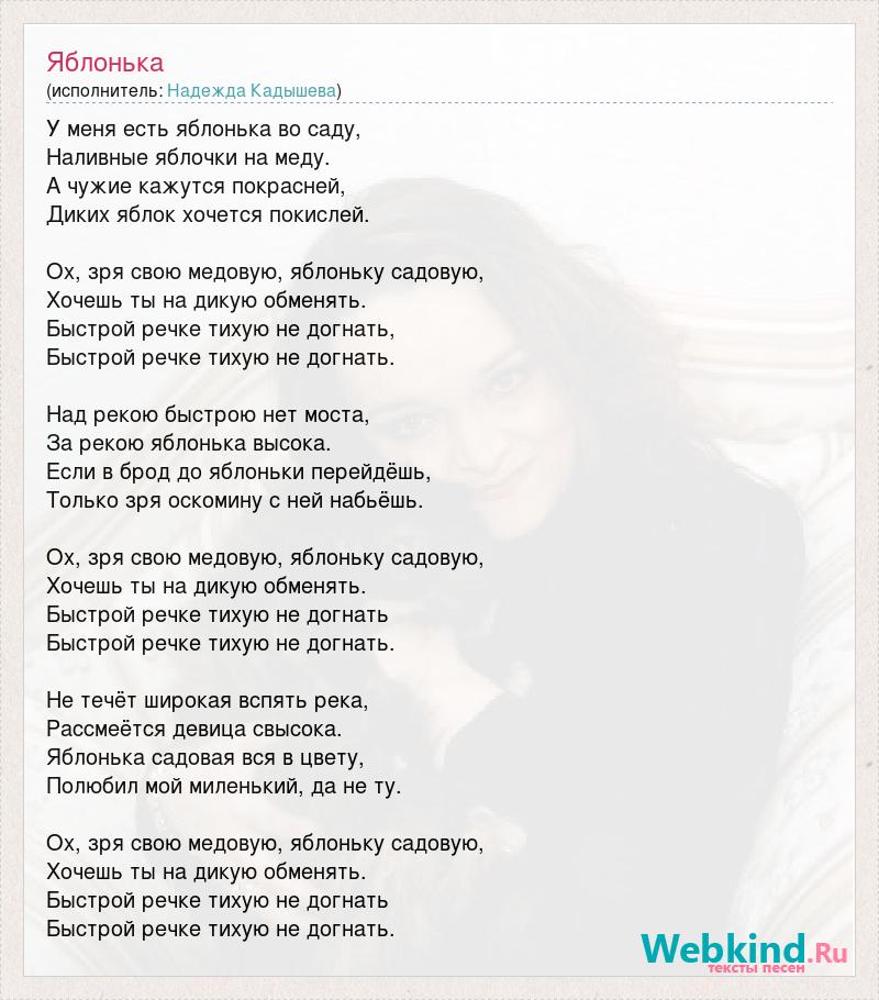 У меня есть яблонька во саду, Наливные яблочки на меду. А чужие кажутся покрасней, Диких яблок хочется покислей. Ох, зря свою медовую, яблоньку садовую, Хочешь ты на дикую обменять. Быстрой речке тихую не догнать, Быстрой речке тихую не догнать. Над рекою быстрою нет моста, За рекою яблонька высока. Если в брод до яблоньки перейдёшь, Только зря оскомину с ней набьёшь. Ох, зря свою медовую, яблоньку садовую, Хочешь ты на дикую обменять. Быстрой речке тихую не догнать Быстрой речке тихую не догнать. Не течёт широкая вспять река, Рассмеётся девица свысока. Яблонька садовая вся в цвету, Полюбил мой миленький, да не ту. Ох, зря свою медовую, яблоньку садовую, Хочешь ты на дикую обменять. Быстрой речке тихую не догнать Быстрой речке тихую не догнать.
