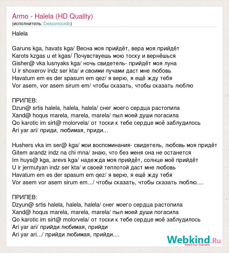 Halela Garuns kga, havats kga/ Весна моя прийдёт, вера моя прийдёт Karots kzgas u et kgas/ Почувствуешь мою тоску и вернёшься Gisher@ vka lusnyaks kga/ ночь свидетель- прийдёт моя луна U ir shoxerov indz ser kta/ и своими лучами даст мне любовь Havatum em es der spasum em qez/ я верю, я ещё жду тебя Vor asem, vor asem sirum em/ чтобы сказать, чтобы сказать люблю ПРИПЕВ: Dzun@ srtis halela, halela, halela/ снег моего сердца растопила Xand@ hoqus marela, marela, marela/ пыл моей души погасила Qo karotic im sirt@ molorvela/ от тоски к тебе сердце моё заблудилось Ari yar ari/ приди, любимая, приди... Hushers vka im ser@ kga/ мои воспоминания- свидетель, любовь моя придёт Gitem arandz indz na chi mna/ знаю, что без меня она не останется Im huys@ kga, arevs kga/ надежда моя прийдёт, солнце моё прийдёт U ir jermutyan indz ser kta/ и своей теплотой даст мне любовь Havatum em es der spasum em qez/ я верю, я ещё жду тебя Vor asem vor asem sirum em.../ чтобы сказать, чтобы сказать люблю.... ПРИПЕВ: Dzyun@ srtis halela, halela, halela/ снег моего сердца растопила Xand@ hoqus marela, marela, marela/ пыл моей души погасила Qo karotic im sirt@ molorvela/ от тоски к тебе сердце моё заблудилось Ari yar ari/ прийди любимая, прийди Ari yar ari.../ прийди любимая, прийди....