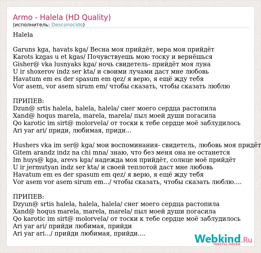 Halela Garuns kga, havats kga/ Весна моя прийдёт, вера моя прийдёт Karots kzgas u et kgas/ Почувствуешь мою тоску и вернёшься Gisher@ vka lusnyaks kga/ ночь свидетель- прийдёт моя луна U ir shoxerov indz ser kta/ и своими лучами даст мне любовь Havatum em es der spasum em qez/ я верю, я ещё жду тебя Vor asem, vor asem sirum em/ чтобы сказать, чтобы сказать люблю ПРИПЕВ: Dzun@ srtis halela, halela, halela/ снег моего сердца растопила Xand@ hoqus marela, marela, marela/ пыл моей души погасила Qo karotic im sirt@ molorvela/ от тоски к тебе сердце моё заблудилось Ari yar ari/ приди, любимая, приди... Hushers vka im ser@ kga/ мои воспоминания- свидетель, любовь моя придёт Gitem arandz indz na chi mna/ знаю, что без меня она не останется Im huys@ kga, arevs kga/ надежда моя прийдёт, солнце моё прийдёт U ir jermutyan indz ser kta/ и своей теплотой даст мне любовь Havatum em es der spasum em qez/ я верю, я ещё жду тебя Vor asem vor asem sirum em.../ чтобы сказать, чтобы сказать люблю.... ПРИПЕВ: Dzyun@ srtis halela, halela, halela/ снег моего сердца растопила Xand@ hoqus marela, marela, marela/ пыл моей души погасила Qo karotic im sirt@ molorvela/ от тоски к тебе сердце моё заблудилось Ari yar ari/ прийди любимая, прийди Ari yar ari.../ прийди любимая, прийди....