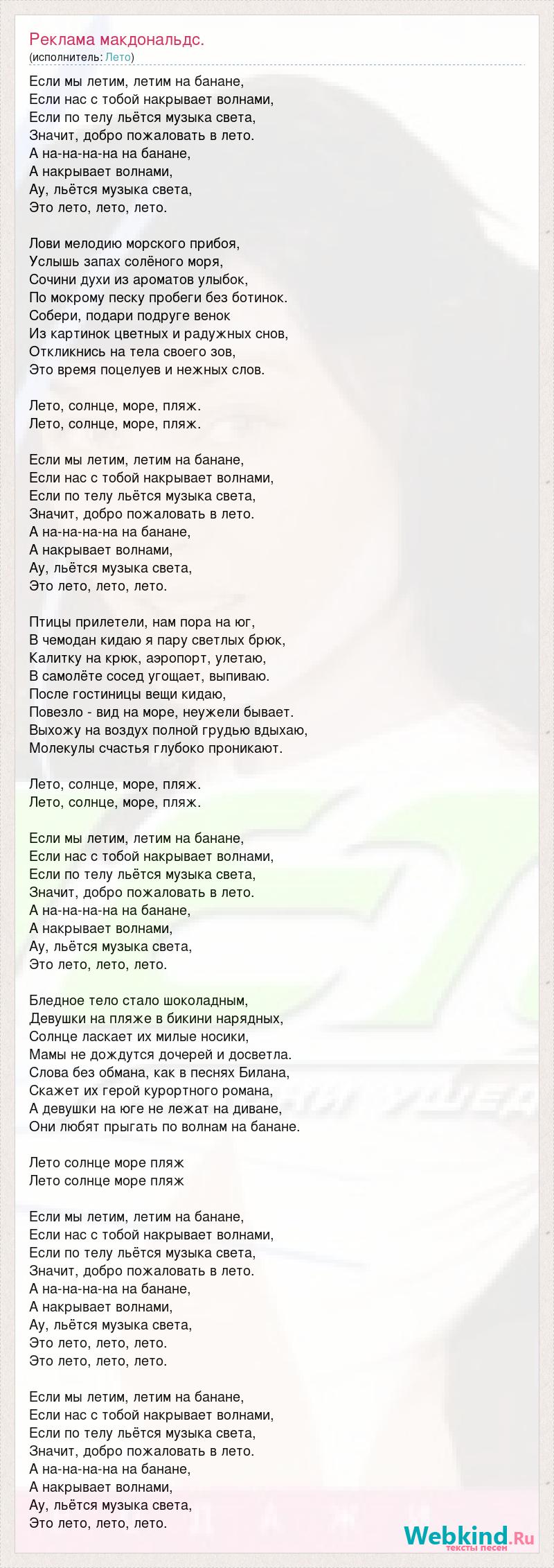 Если мы летим, летим на банане, Если нас с тобой накрывает волнами, Если по телу льётся музыка света, Значит, добро пожаловать в лето. А на-на-на-на на банане, А накрывает волнами, Ау, льётся музыка света, Это лето, лето, лето. Лови мелодию морского прибоя, Услышь запах солёного моря, Сочини духи из ароматов улыбок, По мокрому песку пробеги без ботинок. Собери, подари подруге венок Из картинок цветных и радужных снов, Откликнись на тела своего зов, Это время поцелуев и нежных слов. Лето, солнце, море, пляж. Лето, солнце, море, пляж. Если мы летим, летим на банане, Если нас с тобой накрывает волнами, Если по телу льётся музыка света, Значит, добро пожаловать в лето. А на-на-на-на на банане, А накрывает волнами, Ау, льётся музыка света, Это лето, лето, лето. Птицы прилетели, нам пора на юг, В чемодан кидаю я пару светлых брюк, Калитку на крюк, аэропорт, улетаю, В самолёте сосед угощает, выпиваю. После гостиницы вещи кидаю, Повезло - вид на море, неужели бывает. Выхожу на воздух полной грудью вдыхаю, Молекулы счастья глубоко проникают. Лето, солнце, море, пляж. Лето, солнце, море, пляж. Если мы летим, летим на банане, Если нас с тобой накрывает волнами, Если по телу льётся музыка света, Значит, добро пожаловать в лето. А на-на-на-на на банане, А накрывает волнами, Ау, льётся музыка света, Это лето, лето, лето. Бледное тело стало шоколадным, Девушки на пляже в бикини нарядных, Солнце ласкает их милые носики, Мамы не дождутся дочерей и досветла. Слова без обмана, как в песнях Билана, Скажет их герой курортного романа, А девушки на юге не лежат на диване, Они любят прыгать по волнам на банане. Лето солнце море пляж Лето солнце море пляж Если мы летим, летим на банане, Если нас с тобой накрывает волнами, Если по телу льётся музыка света, Значит, добро пожаловать в лето. А на-на-на-на на банане, А накрывает волнами, Ау, льётся музыка света, Это лето, лето, лето. Это лето, лето, лето. Если мы летим, летим на банане, Если нас с тобой накрывает волнами, Если по телу льётся музыка света, Значит, добро пожаловать в лето. А на-на-на-на на банане, А накрывает волнами, Ау, льётся музыка света, Это лето, лето, лето.