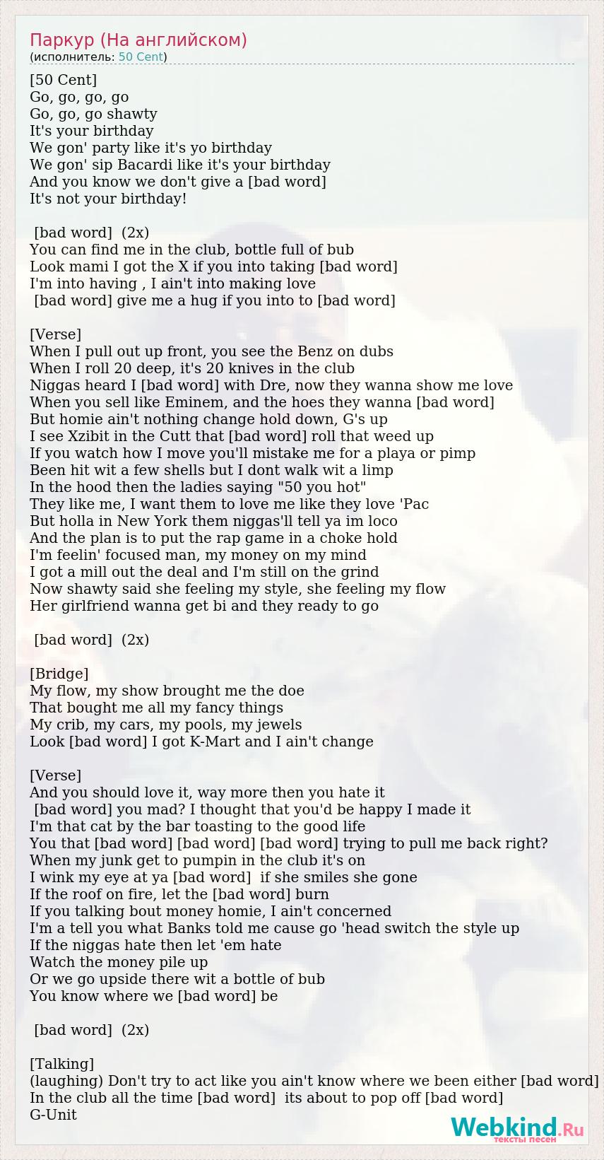 [50 Cent] Go, go, go, go Go, go, go shawty It's your birthday We gon' party like it's yo birthday We gon' sip Bacardi like it's your birthday And you know we don't give a [bad word] It's not your birthday! [bad word] (2x) You can find me in the club, bottle full of bub Look mami I got the X if you into taking [bad word] I'm into having , I ain't into making love [bad word] give me a hug if you into to [bad word] [Verse] When I pull out up front, you see the Benz on dubs When I roll 20 deep, it's 20 knives in the club Niggas heard I [bad word] with Dre, now they wanna show me love When you sell like Eminem, and the hoes they wanna [bad word] But homie ain't nothing change hold down, G's up I see Xzibit in the Cutt that [bad word] roll that weed up If you watch how I move you'll mistake me for a playa or pimp Been hit wit a few shells but I dont walk wit a limp In the hood then the ladies saying "50 you hot" They like me, I want them to love me like they love 'Pac But holla in New York them niggas'll tell ya im loco And the plan is to put the rap game in a choke hold I'm feelin' focused man, my money on my mind I got a mill out the deal and I'm still on the grind Now shawty said she feeling my style, she feeling my flow Her girlfriend wanna get bi and they ready to go [bad word] (2x) [Bridge] My flow, my show brought me the doe That bought me all my fancy things My crib, my cars, my pools, my jewels Look [bad word] I got K-Mart and I ain't change [Verse] And you should love it, way more then you hate it [bad word] you mad? I thought that you'd be happy I made it I'm that cat by the bar toasting to the good life You that [bad word] [bad word] [bad word] trying to pull me back right? When my junk get to pumpin in the club it's on I wink my eye at ya [bad word] if she smiles she gone If the roof on fire, let the [bad word] burn If you talking bout money homie, I ain't concerned I'm a tell you what Banks told me cause go 'head switch the style up If the niggas hate then let 'em hate Watch the money pile up Or we go upside there wit a bottle of bub You know where we [bad word] be [bad word] (2x) [Talking] (laughing) Don't try to act like you ain't know where we been either [bad word] In the club all the time [bad word] its about to pop off [bad word] G-Unit