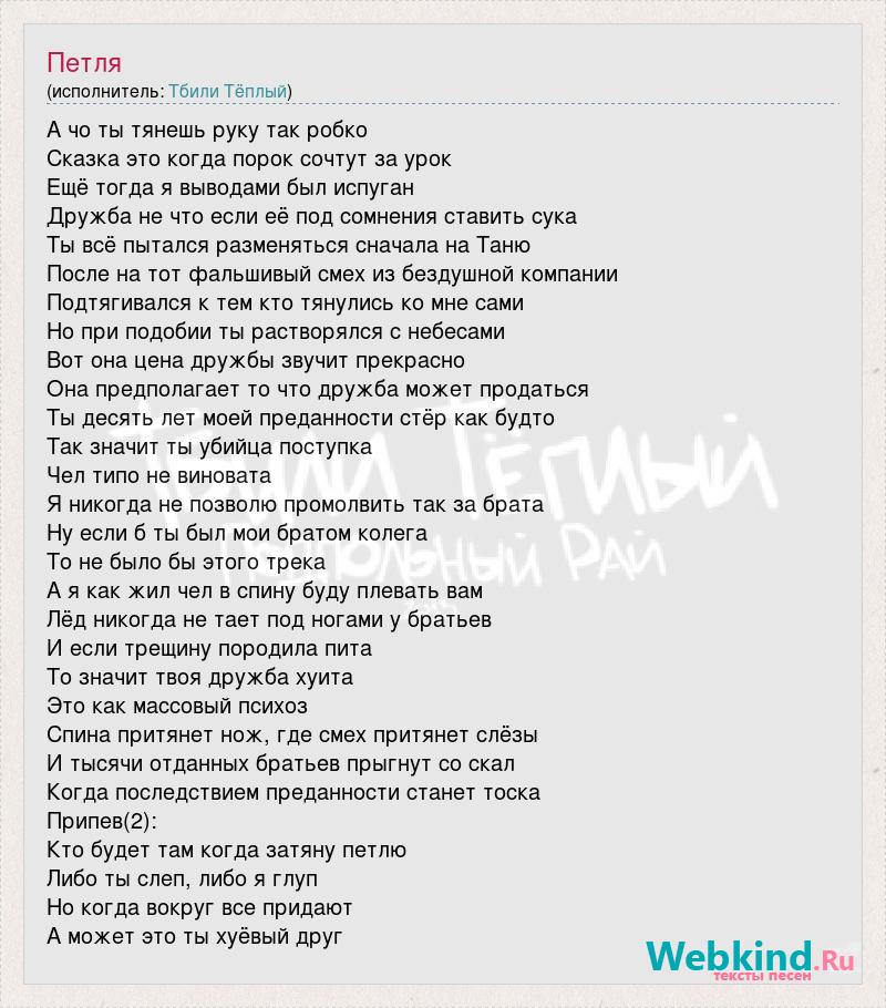 А чо ты тянешь руку так робко Сказка это когда порок сочтут за урок Ещё тогда я выводами был испуган Дружба не что если её под сомнения ставить сука Ты всё пытался разменяться сначала на Таню После на тот фальшивый смех из бездушной компании Подтягивался к тем кто тянулись ко мне сами Но при подобии ты растворялся с небесами Вот она цена дружбы звучит прекрасно Она предполагает то что дружба может продаться Ты десять лет моей преданности стёр как будто Так значит ты убийца поступка Чел типо не виновата Я никогда не позволю промолвить так за брата Ну если б ты был мои братом колега То не было бы этого трека А я как жил чел в спину буду плевать вам Лёд никогда не тает под ногами у братьев И если трещину породила пита То значит твоя дружба хуита Это как массовый психоз Спина притянет нож, где смех притянет слёзы И тысячи отданных братьев прыгнут со скал Когда последствием преданности станет тоска Припев(2): Кто будет там когда затяну петлю Либо ты слеп, либо я глуп Но когда вокруг все придают А может это ты хуёвый друг