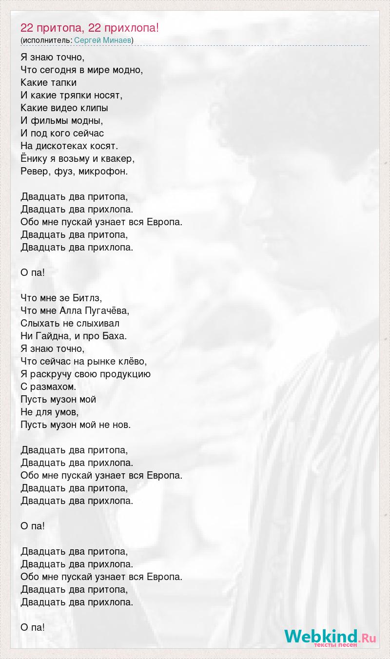 Я знаю точно, Что сегодня в мире модно, Какие тапки И какие тряпки носят, Какие видео клипы И фильмы модны, И под кого сейчас На дискотеках косят. Ёнику я возьму и квакер, Ревер, фуз, микрофон. Двадцать два притопа, Двадцать два прихлопа. Обо мне пускай узнает вся Европа. Двадцать два притопа, Двадцать два прихлопа. О па! Что мне зе Битлз, Что мне Алла Пугачёва, Слыхать не слыхивал Ни Гайдна, и про Баха. Я знаю точно, Что сейчас на рынке клёво, Я раскручу свою продукцию С размахом. Пусть музон мой Не для умов, Пусть музон мой не нов. Двадцать два притопа, Двадцать два прихлопа. Обо мне пускай узнает вся Европа. Двадцать два притопа, Двадцать два прихлопа. О па! Двадцать два притопа, Двадцать два прихлопа. Обо мне пускай узнает вся Европа. Двадцать два притопа, Двадцать два прихлопа. О па!