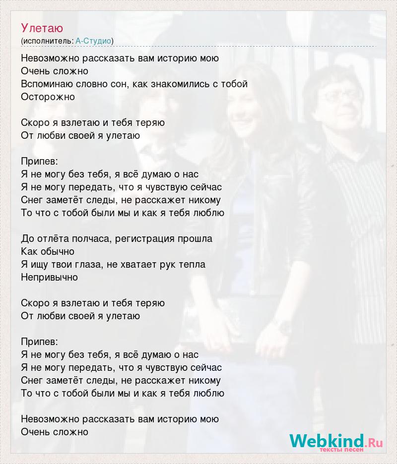Невозможно рассказать вам историю мою Очень сложно Вспоминаю словно сон, как знакомились с тобой Осторожно Скоро я взлетаю и тебя теряю От любви своей я улетаю Припев: Я не могу без тебя, я всё думаю о нас Я не могу передать, что я чувствую сейчас Снег заметёт следы, не расскажет никому То что с тобой были мы и как я тебя люблю До отлёта полчаса, регистрация прошла Как обычно Я ищу твои глаза, не хватает рук тепла Непривычно Скоро я взлетаю и тебя теряю От любви своей я улетаю Припев: Я не могу без тебя, я всё думаю о нас Я не могу передать, что я чувствую сейчас Снег заметёт следы, не расскажет никому То что с тобой были мы и как я тебя люблю Невозможно рассказать вам историю мою Очень сложно
