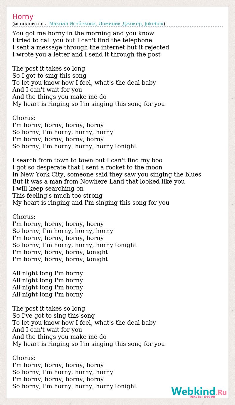 You got me horny in the morning and you know I tried to call you but I can't find the telephone I sent a message through the internet but it rejected I wrote you a letter and I send it through the post The post it takes so long So I got to sing this song To let you know how I feel, what's the deal baby And I can't wait for you And the things you make me do My heart is ringing so I'm singing this song for you Chorus: I'm horny, horny, horny, horny So horny, I'm horny, horny, horny I'm horny, horny, horny, horny So horny, I'm horny, horny, horny tonight I search from town to town but I can't find my boo I got so desperate that I sent a rocket to the moon In New York City, someone said they saw you singing the blues But it was a man from Nowhere Land that looked like you I will keep searching on This feeling's much too strong My heart is ringing and I'm singing this song for you Chorus: I'm horny, horny, horny, horny So horny, I'm horny, horny, horny I'm horny, horny, horny, horny So horny, I'm horny, horny, horny tonight I'm horny, horny, horny, tonight I'm horny, horny, horny, tonight All night long I'm horny All night long I'm horny All night long I'm horny All night long I'm horny The post it takes so long So I've got to sing this song To let you know how I feel, what's the deal baby And I can't wait for you And the things you make me do My heart is ringing so I'm singing this song for you Chorus: I'm horny, horny, horny, horny So horny, I'm horny, horny, horny I'm horny, horny, horny, horny So horny, I'm horny, horny, horny tonight