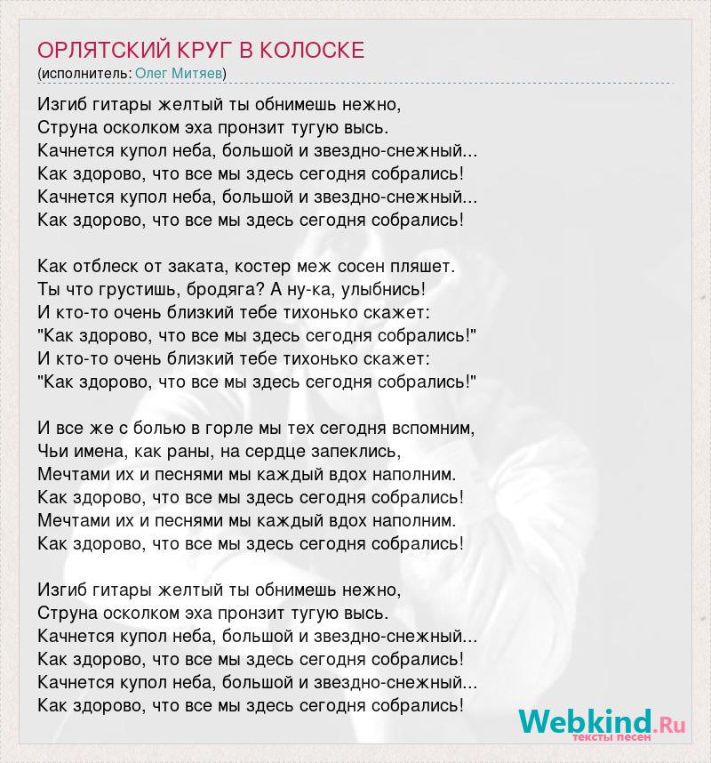 Изгиб гитары желтый ты обнимешь нежно, Струна осколком эха пронзит тугую высь. Качнется купол неба, большой и звездно-снежный... Как здорово, что все мы здесь сегодня собрались! Качнется купол неба, большой и звездно-снежный... Как здорово, что все мы здесь сегодня собрались! Как отблеск от заката, костер меж сосен пляшет. Ты что грустишь, бродяга? А ну-ка, улыбнись! И кто-то очень близкий тебе тихонько скажет: "Как здорово, что все мы здесь сегодня собрались!" И кто-то очень близкий тебе тихонько скажет: "Как здорово, что все мы здесь сегодня собрались!" И все же с болью в горле мы тех сегодня вспомним, Чьи имена, как раны, на сердце запеклись, Мечтами их и песнями мы каждый вдох наполним. Как здорово, что все мы здесь сегодня собрались! Мечтами их и песнями мы каждый вдох наполним. Как здорово, что все мы здесь сегодня собрались! Изгиб гитары желтый ты обнимешь нежно, Струна осколком эха пронзит тугую высь. Качнется купол неба, большой и звездно-снежный... Как здорово, что все мы здесь сегодня собрались! Качнется купол неба, большой и звездно-снежный... Как здорово, что все мы здесь сегодня собрались!