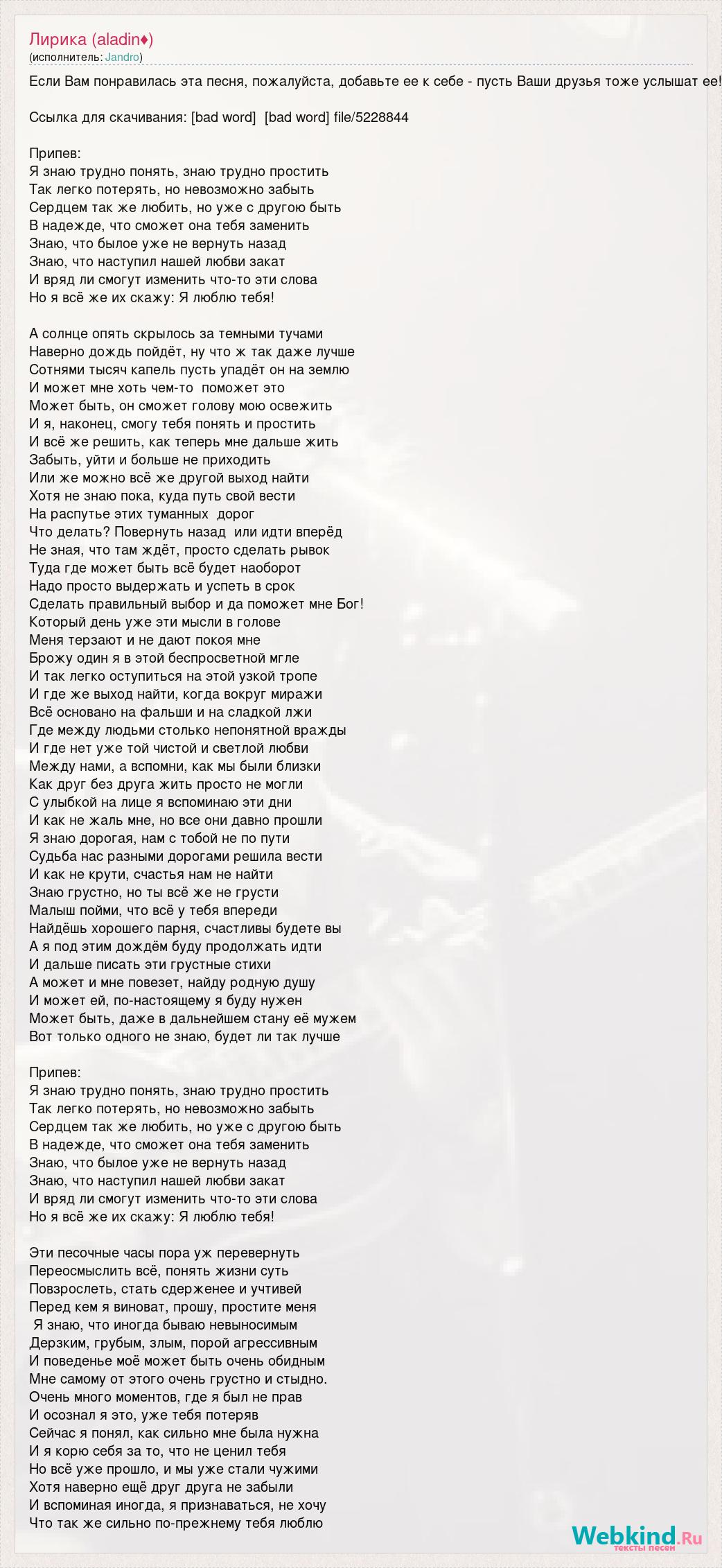 Если Вам понравилась эта песня, пожалуйста, добавьте ее к себе - пусть Ваши друзья тоже услышат ее! Ссылка для скачивания: [bad word] [bad word] file/5228844 Припев: Я знаю трудно понять, знаю трудно простить Так легко потерять, но невозможно забыть Сердцем так же любить, но уже с другою быть В надежде, что сможет она тебя заменить Знаю, что былое уже не вернуть назад Знаю, что наступил нашей любви закат И вряд ли смогут изменить что-то эти слова Но я всё же их скажу: Я люблю тебя! А солнце опять скрылось за темными тучами Наверно дождь пойдёт, ну что ж так даже лучше Сотнями тысяч капель пусть упадёт он на землю И может мне хоть чем-то поможет это Может быть, он сможет голову мою освежить И я, наконец, смогу тебя понять и простить И всё же решить, как теперь мне дальше жить Забыть, уйти и больше не приходить Или же можно всё же другой выход найти Хотя не знаю пока, куда путь свой вести На распутье этих туманных дорог Что делать? Повернуть назад или идти вперёд Не зная, что там ждёт, просто сделать рывок Туда где может быть всё будет наоборот Надо просто выдержать и успеть в срок Сделать правильный выбор и да поможет мне Бог! Который день уже эти мысли в голове Меня терзают и не дают покоя мне Брожу один я в этой беспросветной мгле И так легко оступиться на этой узкой тропе И где же выход найти, когда вокруг миражи Всё основано на фальши и на сладкой лжи Где между людьми столько непонятной вражды И где нет уже той чистой и светлой любви Между нами, а вспомни, как мы были близки Как друг без друга жить просто не могли С улыбкой на лице я вспоминаю эти дни И как не жаль мне, но все они давно прошли Я знаю дорогая, нам с тобой не по пути Судьба нас разными дорогами решила вести И как не крути, счастья нам не найти Знаю грустно, но ты всё же не грусти Малыш пойми, что всё у тебя впереди Найдёшь хорошего парня, счастливы будете вы А я под этим дождём буду продолжать идти И дальше писать эти грустные стихи А может и мне повезет, найду родную душу И может ей, по-настоящему я буду нужен Может быть, даже в дальнейшем стану её мужем Вот только одного не знаю, будет ли так лучше Припев: Я знаю трудно понять, знаю трудно простить Так легко потерять, но невозможно забыть Сердцем так же любить, но уже с другою быть В надежде, что сможет она тебя заменить Знаю, что былое уже не вернуть назад Знаю, что наступил нашей любви закат И вряд ли смогут изменить что-то эти слова Но я всё же их скажу: Я люблю тебя! Эти песочные часы пора уж перевернуть Переосмыслить всё, понять жизни суть Повзрослеть, стать сдерженее и учтивей Перед кем я виноват, прошу, простите меня Я знаю, что иногда бываю невыносимым Дерзким, грубым, злым, порой агрессивным И поведенье моё может быть очень обидным Мне самому от этого очень грустно и стыдно. Очень много моментов, где я был не прав И осознал я это, уже тебя потеряв Сейчас я понял, как сильно мне была нужна И я корю себя за то, что не ценил тебя Но всё уже прошло, и мы уже стали чужими Хотя наверно ещё друг друга не забыли И вспоминая иногда, я признаваться, не хочу Что так же сильно по-прежнему тебя люблю