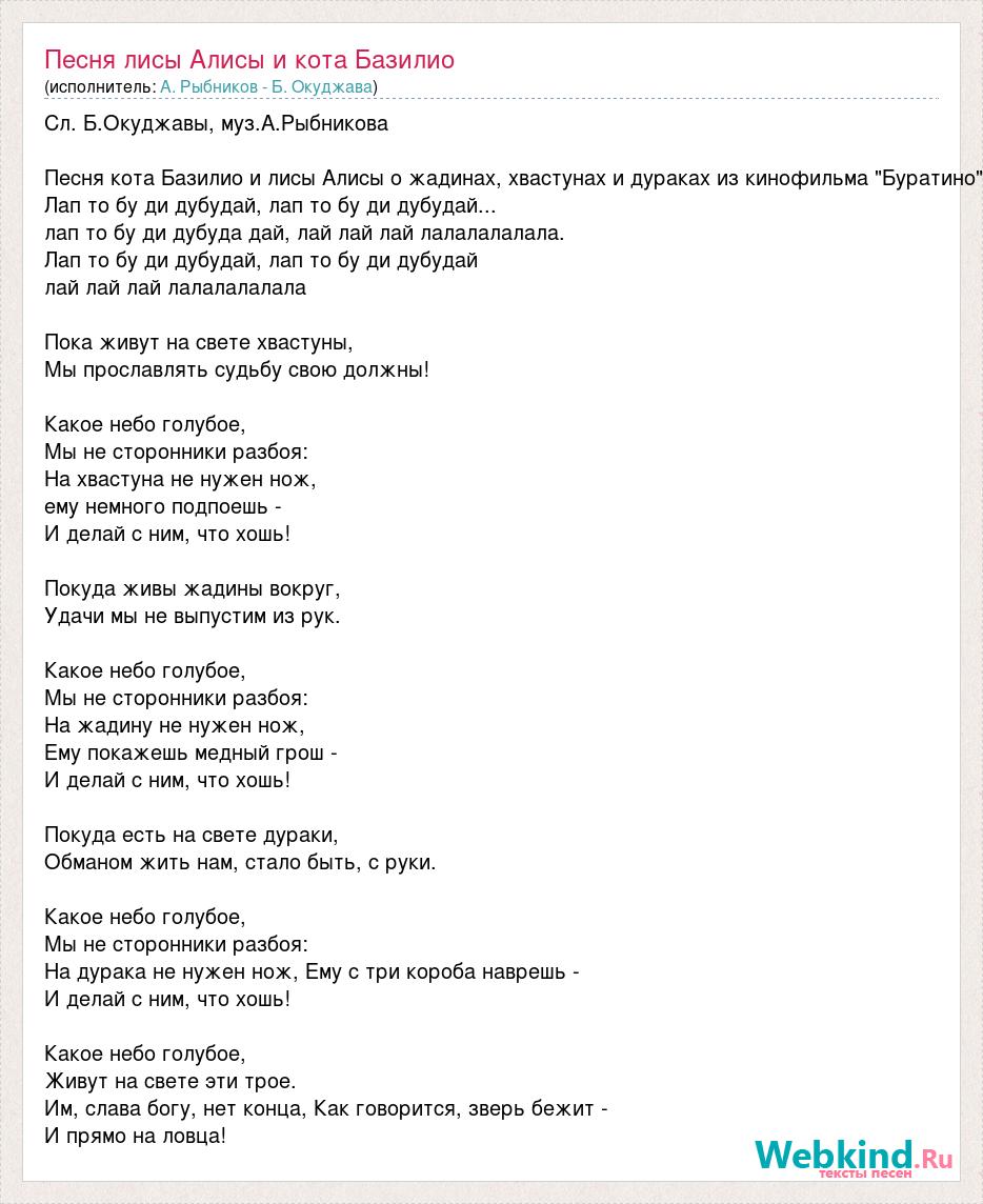 Сл. Б.Окуджавы, муз.А.Рыбникова Песня кота Базилио и лисы Алисы о жадинах, хвастунах и дураках из кинофильма "Буратино" Лап то бу ди дубудай, лап то бу ди дубудай... лап то бу ди дубуда дай, лай лай лай лалалалалала. Лап то бу ди дубудай, лап то бу ди дубудай лай лай лай лалалалалала Пока живут на свете хвастуны, Мы прославлять судьбу свою должны! Какое небо голубое, Мы не сторонники разбоя: На хвастуна не нужен нож, ему немного подпоешь - И делай с ним, что хошь! Покуда живы жадины вокруг, Удачи мы не выпустим из рук. Какое небо голубое, Мы не сторонники разбоя: На жадину не нужен нож, Ему покажешь медный грош - И делай с ним, что хошь! Покуда есть на свете дураки, Обманом жить нам, стало быть, с руки. Какое небо голубое, Мы не сторонники разбоя: На дурака не нужен нож, Ему с три короба наврешь - И делай с ним, что хошь! Какое небо голубое, Живут на свете эти трое. Им, слава богу, нет конца, Как говорится, зверь бежит - И прямо на ловца!