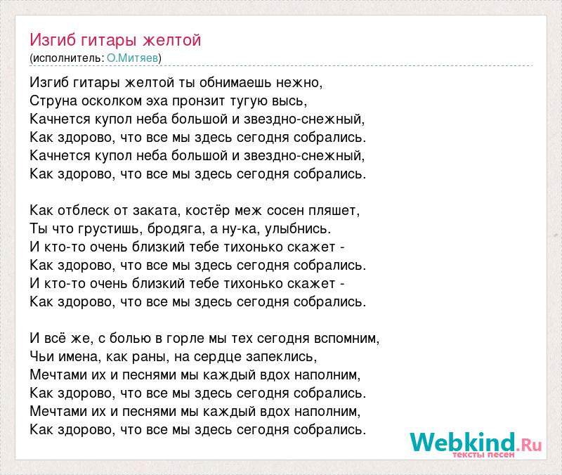 Изгиб гитары желтой ты обнимаешь нежно, Струна осколком эха пронзит тугую высь, Качнется купол неба большой и звездно-снежный, Как здорово, что все мы здесь сегодня собрались. Качнется купол неба большой и звездно-снежный, Как здорово, что все мы здесь сегодня собрались. Как отблеск от заката, костёр меж сосен пляшет, Ты что грустишь, бродяга, а ну-ка, улыбнись. И кто-то очень близкий тебе тихонько скажет - Как здорово, что все мы здесь сегодня собрались. И кто-то очень близкий тебе тихонько скажет - Как здорово, что все мы здесь сегодня собрались. И всё же, с болью в горле мы тех сегодня вспомним, Чьи имена, как раны, на сердце запеклись, Мечтами их и песнями мы каждый вдох наполним, Как здорово, что все мы здесь сегодня собрались. Мечтами их и песнями мы каждый вдох наполним, Как здорово, что все мы здесь сегодня собрались.
