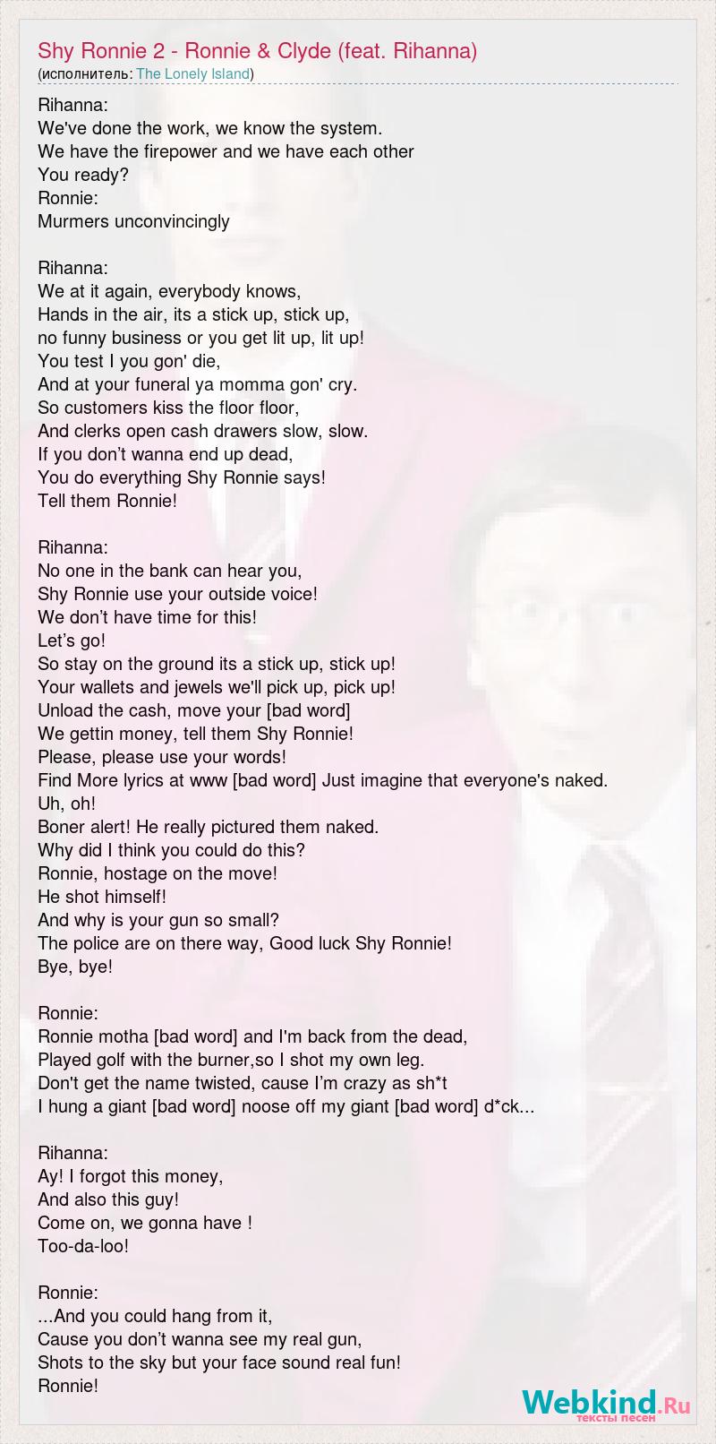 Rihanna: We've done the work, we know the system. We have the firepower and we have each other You ready? Ronnie: Murmers unconvincingly Rihanna: We at it again, everybody knows, Hands in the air, its a stick up, stick up, no funny business or you get lit up, lit up! You test I you gon' die, And at your funeral ya momma gon' cry. So customers kiss the floor floor, And clerks open cash drawers slow, slow. If you don’t wanna end up dead, You do everything Shy Ronnie says! Tell them Ronnie! Rihanna: No one in the bank can hear you, Shy Ronnie use your outside voice! We don’t have time for this! Let’s go! So stay on the ground its a stick up, stick up! Your wallets and jewels we'll pick up, pick up! Unload the cash, move your [bad word] We gettin money, tell them Shy Ronnie! Please, please use your words! Find More lyrics at www [bad word] Just imagine that everyone's naked. Uh, oh! Boner alert! He really pictured them naked. Why did I think you could do this? Ronnie, hostage on the move! He shot himself! And why is your gun so small? The police are on there way, Good luck Shy Ronnie! Bye, bye! Ronnie: Ronnie motha [bad word] and I'm back from the dead, Played golf with the burner,so I shot my own leg. Don't get the name twisted, cause I’m crazy as sh*t I hung a giant [bad word] noose off my giant [bad word] d*ck... Rihanna: Ay! I forgot this money, And also this guy! Come on, we gonna have ! Too-da-loo! Ronnie: ...And you could hang from it, Cause you don’t wanna see my real gun, Shots to the sky but your face sound real fun! Ronnie!