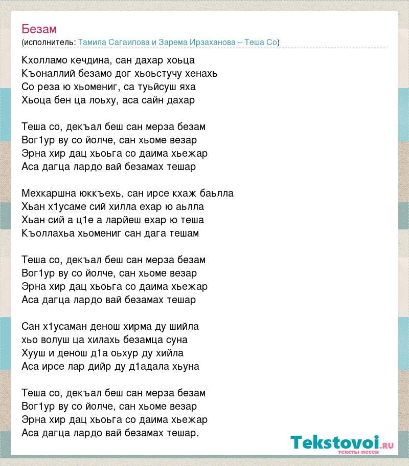 Кхолламо кечдина, сан дахар хоьца Къоналлий безамо дог хьоьстучу хенахь Со реза ю хьомениг, са туьйсуш яха Хьоца бен ца лоьху, аса сайн дахар Теша со, декъал беш сан мерза безам Вог1ур ву со йолче, сан хьоме везар Эрна хир дац хьоьга со даима хьежар Аса дагца лардо вай безамах тешар Мехкаршна юккъехь, сан ирсе кхаж баьлла Хьан х1усаме сий хилла ехар ю аьлла Хьан сий а ц1е а ларйеш ехар ю теша Къоллахьа хьомениг сан дага тешам Теша со, декъал беш сан мерза безам Вог1ур ву со йолче, сан хьоме везар Эрна хир дац хьоьга со даима хьежар Аса дагца лардо вай безамах тешар Сан х1усаман денош хирма ду шийла хьо волуш ца хилахь безамца суна Хууш и денош д1а оьхур ду хийла Аса ирсе лар дийр ду д1адала хьуна Теша со, декъал беш сан мерза безам Вог1ур ву со йолче, сан хьоме везар Эрна хир дац хьоьга со даима хьежар Аса дагца лардо вай безамах тешар.