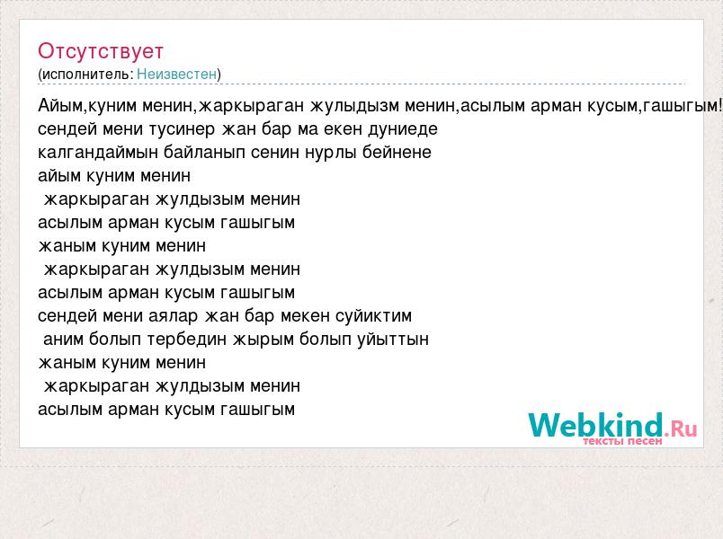 Айым,куним менин,жаркыраган жулыдызм менин,асылым арман кусым,гашыгым! сендей мени тусинер жан бар ма екен дуниеде калгандаймын байланып сенин нурлы бейнене айым куним менин жаркыраган жулдызым менин асылым арман кусым гашыгым жаным куним менин жаркыраган жулдызым менин асылым арман кусым гашыгым сендей мени аялар жан бар мекен суйиктим аним болып тербедин жырым болып уйыттын жаным куним менин жаркыраган жулдызым менин асылым арман кусым гашыгым